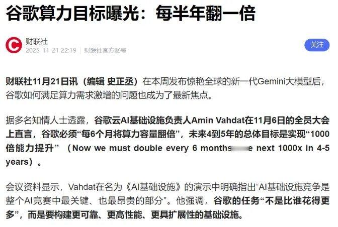 难怪巴菲特会买谷歌的股票,这公司现在确实厉害!它刚推出的最新AI模型Gemini 3,性能直接超过了GPT-5,不管是推理、数学还是编程能力都领先一截 。更让人吃惊的是谷歌的野心,放话说要每6个月就把算力容量翻一番,未来4到5年还要实现1000倍的能力提升——而且不是靠堆成本,是在相同能耗和花费下做到的 。现在这模型已经够聪明了,再翻1000倍的话,全球的AI大模型格局估计都要被改写,之前OpenAI的风头,这下又被谷歌抢回去了。有人说全球科技泡沫要破,但看谷歌这动作,明显是在实打实推进技术。这就让人忍不住想,国内的算力基础设施还有多少差距要补?咱们的大科技公司,是停下脚步了还是在加紧追赶?其实答案已经很清楚了。