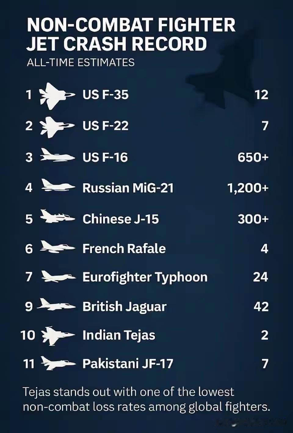光辉战机坠毁两架,但三哥很自豪,因为光辉战机是全球坠机最少的战机,只有两架。美国的F22坠机7架,F35坠机12架,F16坠机650架以上,俄罗斯的米格高达1200多架,中国的J15也有300多架,你们看看印度只是坠机2架而已,不值得自豪吗?据了解,印度的光辉战机也只生产了30多架而已,但三哥不会把这数据列表里面。如果按比率算坠机就到达6.6%。
