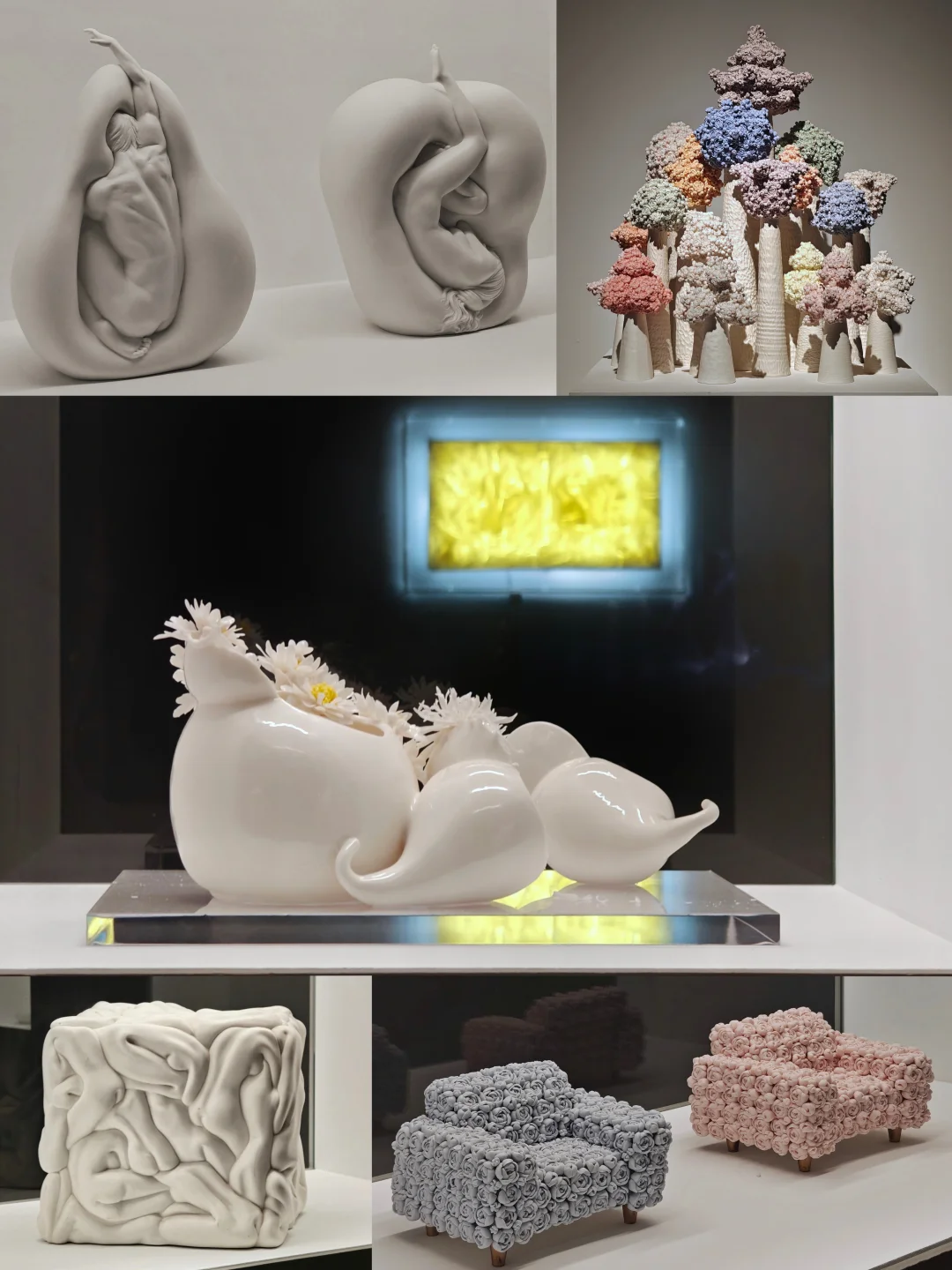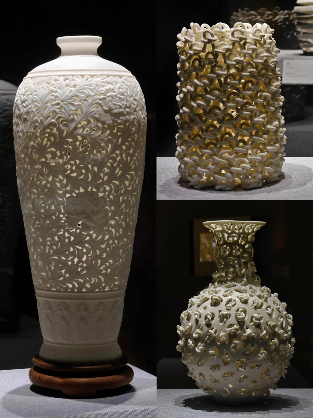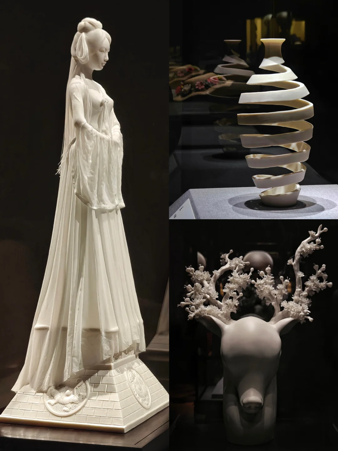 👉其实我没想到这个展会这么火爆,在福州和泉州看德化瓷都没什么观众的,上海人民的热情是真的高涨……特地避开了暑假,临近闭展的9月工作日下午还是有不少观众,但至少能拍到空镜了。布置总体还是很有氛围感的,尤其第一个展厅,暗色调增强了瓷器的质感。第一单元全是炫技之作,从工艺美术角度来说确实非常强;不过个人还是对第二单元有文物的板块比较感兴趣,泉州博物馆的展品稍显一般,此处还是更推荐大家有机会去福建博物院看德化瓷展厅,都是精品;蕞后一个展厅的创新瓷器倒是挺有趣的,可惜灯光有频闪,扣分。