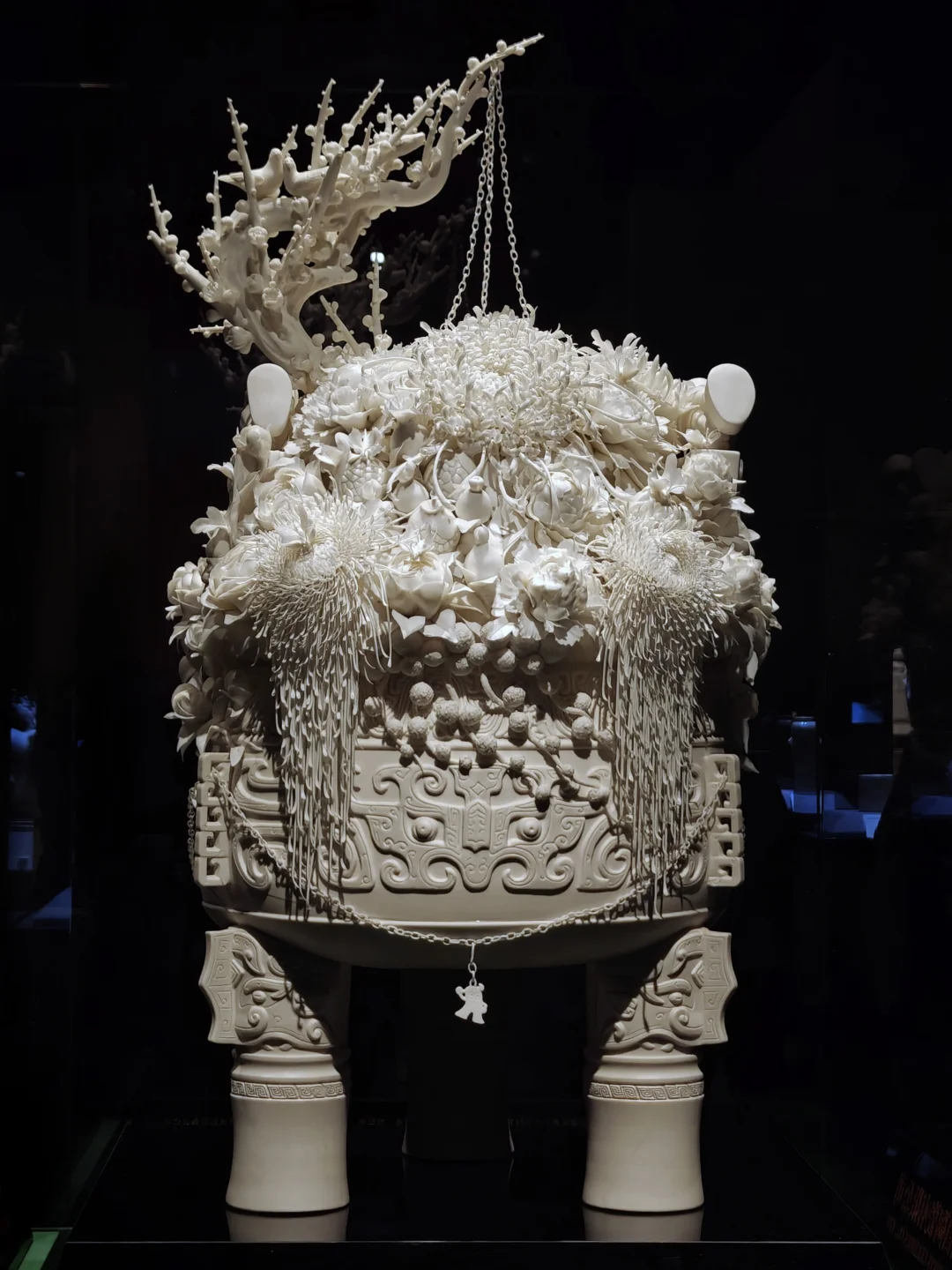 ⚪️世博和鼎:世博会福建馆镇馆之宝,瓷鼎饰有四大神兽浮雕,百朵瓷花绽放,寓意“万物和谐共生”