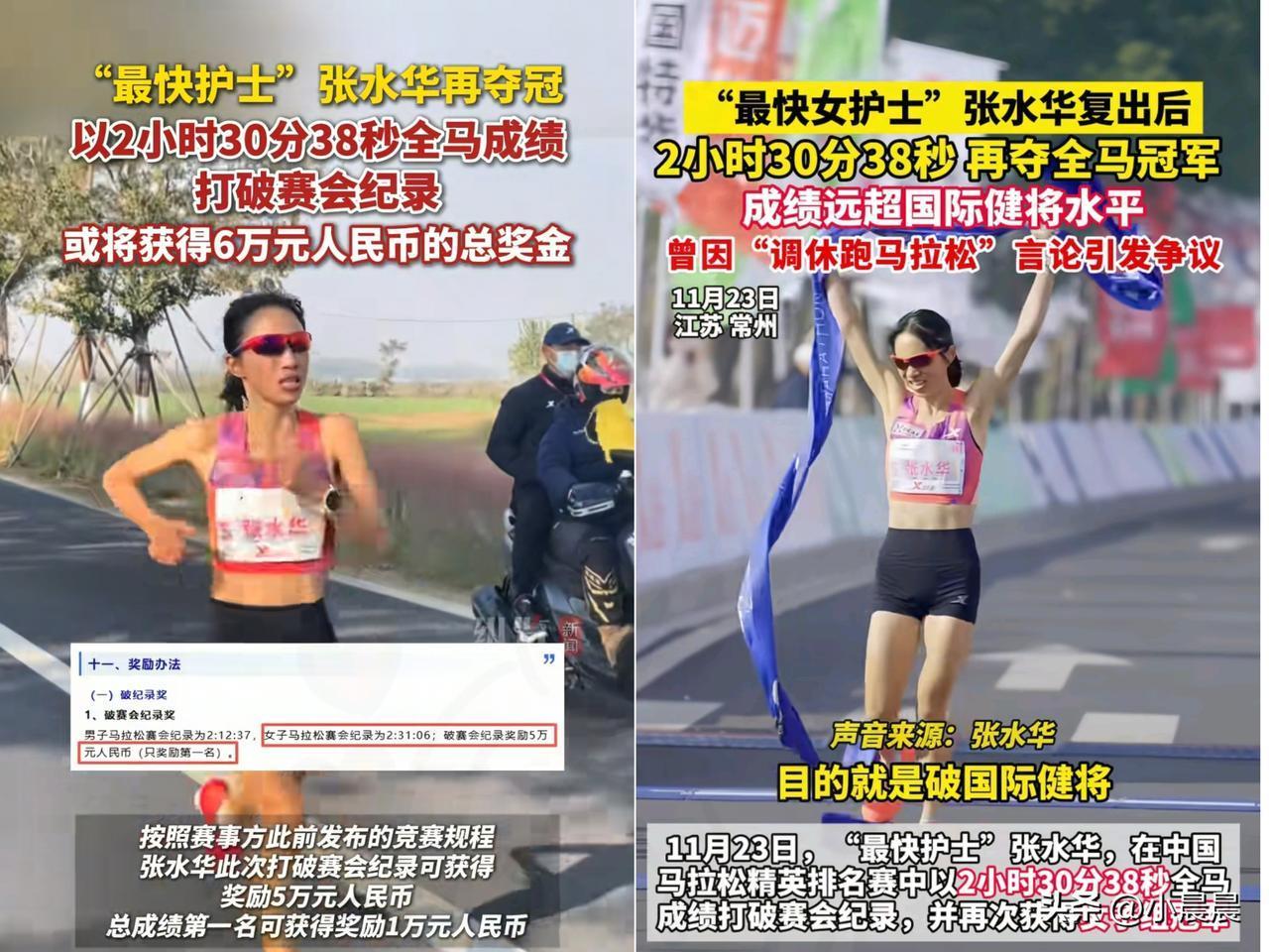 不服不行! “最快女护士”张水华又上热搜, 这次不是因为情商问题,而是 因为她刷新了个人的最好成绩。 之前因调休言论引发争议,如今她用双脚跑出了最硬的回应! 2小时30分38秒断层冲线,破赛会纪录还超国际健将标准,21天内连拿宜昌、常州两站马拉松冠军,狂揽17万奖金! 要知道她可是主业护士,白班夜班连轴转,训练全靠见缝插针。 所谓平衡从不是时间均分,而是把热爱做到极致的执念。 她没因争议放弃,也没因爱好耽误工作,反而让两者互相成就。 这才是成年人最好的状态:不被舆论裹挟,不被身份设限,用实力回击质疑。 你觉得兼顾工作和爱好,关键是时间管理还是极致热爱?
