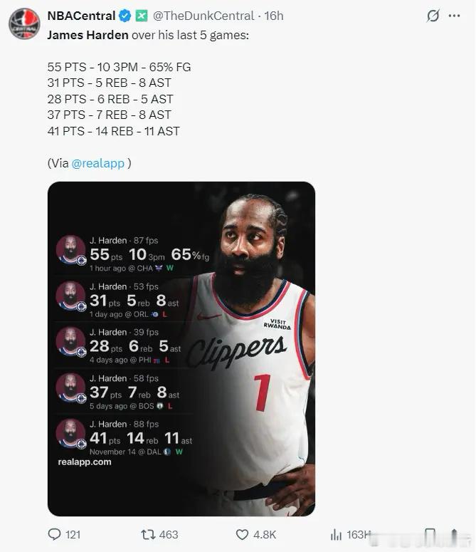 美媒高呼哈登孤胆英雄!创14纪录显悲凉 36岁硬扛快船夺冠成奢求 詹姆斯-哈登对阵黄蜂一战,全场比赛35分钟,26中17,三分16中10,罚球14中11,拿到55分7助攻3篮板1抢断,命中率65.4%,三分命中率62.5%,真实命中率85.5%,正负值+22,快船终于拿到了赛季第五场胜利赛后美媒Hater Report写道:真心觉得詹姆斯-哈登一人拯救了一支NBA球队,他是真正的孤胆英雄。这张图片相信大家已经看过无数次,这是哈登本赛季的真实写照,小卡高挂免战牌,据悉他下周一才可能复出,比尔赛季报销,小琼斯还没有复出时间表,哈登真的太难了。这一场比赛哈登创造了超多的纪录:1.首节27分快船生涯单节新高;2.半场35分是赛季联盟所有人最高;3.55分是哈登赛季新高得分;4.55分也是快船队史单场新高;5.哈登是快船队史第二位拿到50+的球员;6.哈登单场命中10个三分追平快船队史最多;7.35岁以上球员半场35分历史4人;8.生涯第25次50+追平科比排在历史第三多;9.历史唯一,哈登拥有快船(55)、火箭(61)两支球队的单场最高;10.哈登是历史年龄第四大拿到55分的球员;11.哈登10个三分球也是生涯单场最高,追平19年自己的纪录;12.哈登过去五场比赛拿到192分,此前从未有36岁+的球员做到过;13.55分+2失误,是哈登生涯单场50+失误最少得一次;14.生涯第12次拿到55+,历史上仅次于张伯伦过去的五场比赛哈登场均38.4分7.8助攻7篮板,命中率47.4%,三分命中率45.2%,但快船只赢下了两场比赛而已,36岁的老哈登还要一个人扛着快船,这何尝不是一种悲哀?