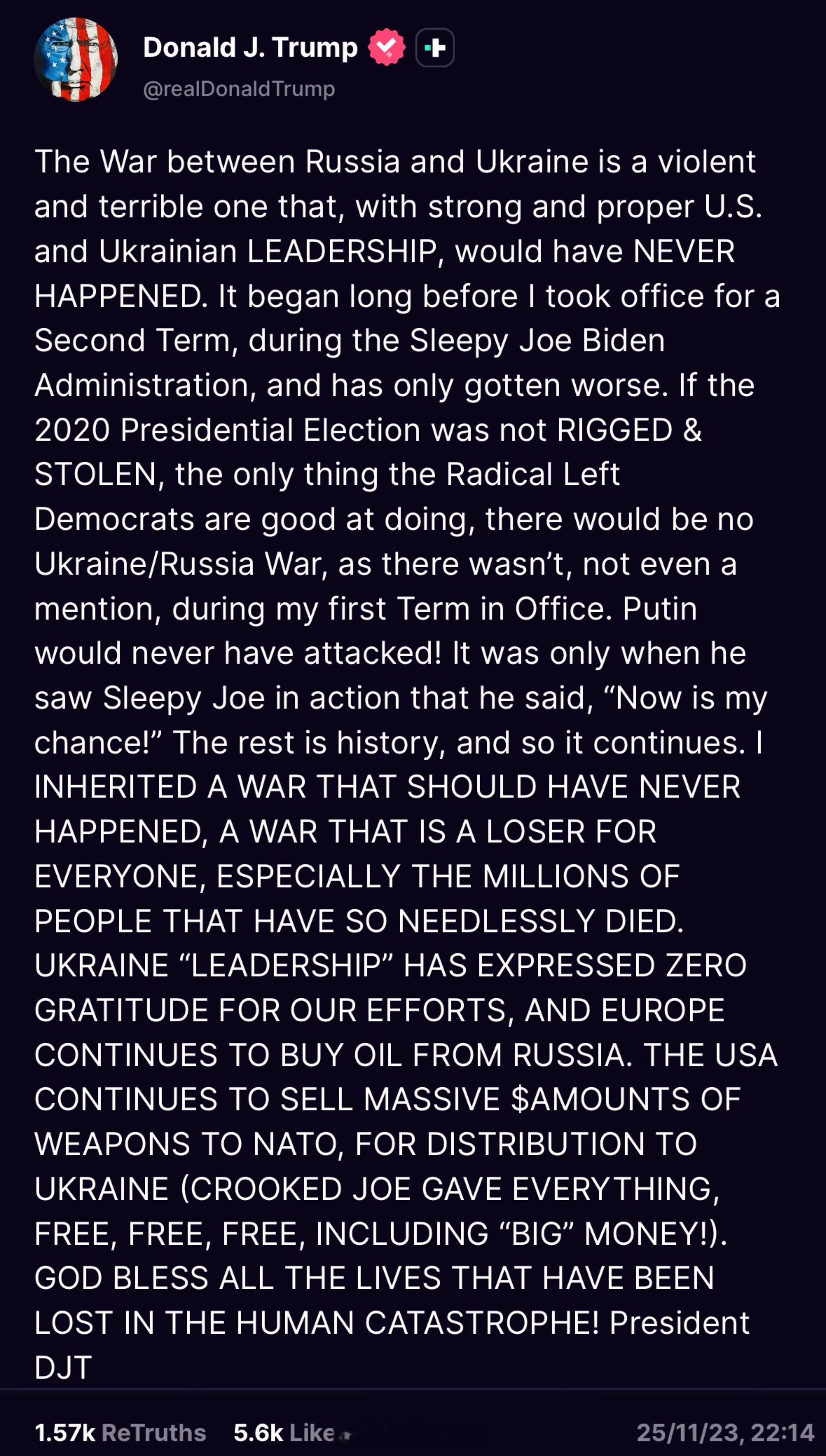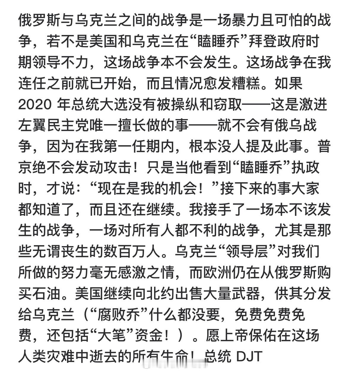 特朗普发长文回应俄乌战争如果2020年总统大选没有被操控,这场战争永远不会发生,软弱的“瞌睡乔”给了普京机会;特朗普在文中表示,既然欧洲不接受“28点和平方案”,那美国会继续卖武器给北约,你们接着打