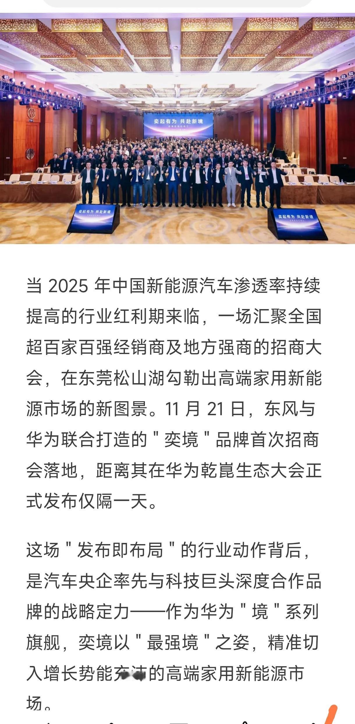奕境将先完成 TOP50 城市的首批授权,再阶梯式拓展全国市场。科技共襄,技术共享,唯有打破壁垒、携手共进,才能推动“中国智造”驶向更广阔的舞台。 网传奕境说要划区保护,但第一批只开放五十个城市授权!不少区域代理为了抢名额直接亮出底牌,华东一家经销商承诺三年让利百分之十五,广东一家集团则拿出本地华为门店的资源做筹码,有人私下说,现在争的不是眼前利益,是入场券。 奕境的诞生不仅是一个新品牌的落地,更是央企与科技企业合作模式的标杆。当新能源汽车行业从规模扩张转向高质量发展,这种 " 制造底蕴 + 智能技术 " 的融合路径,或许将成为传统车企转型的新范式。而对消费者而言,这场双强联手的 " 创业 ",终将转化为高端家用新能源市场的更优选择。 华为乾崑是一个独立的品牌,这次的华为乾崑生态大会上,华为车BU CEO靳玉志公布了很多新的举措。独立App集合了购车商城、VR展厅,甚至还有生态商城的功能。预计2026年接入超20款车型。最重要的是,这个App它带车控?!不仅有超方便的数字钥匙功能,还有多项远程控车功能!