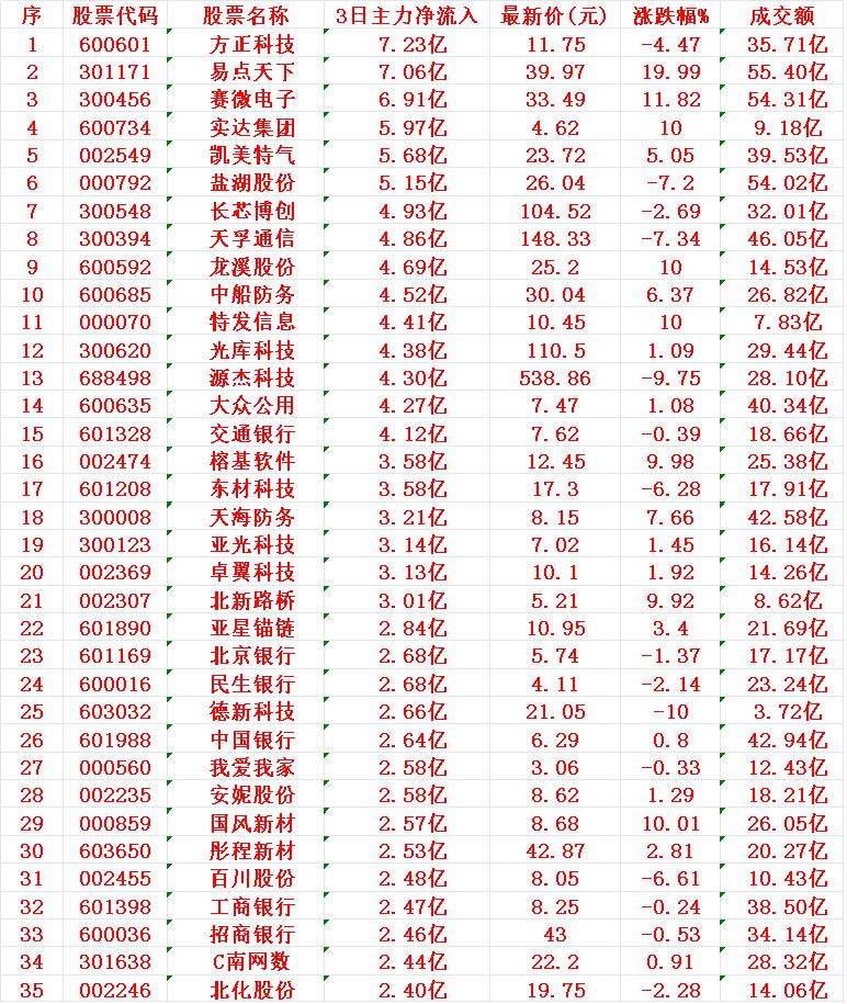 11月24日,前3天主力大幅买入的35名单! 方正科技:3日主力净流入 7.23亿元,最新价 11.75元 易点天下:3日主力净流入 7.06亿元,最新价 39.97元 赛微电子:3日主力净流入 6.91亿元,最新价 33.49元 实达集团:3日主力净流入 5.97亿元,最新价 4.62元 凯美特气:3日主力净流入 5.68亿元,最新价 23.72元 盐湖股份:3日主力净流入 5.15亿元,最新价 26.04元 长芯博创:3日主力净流入 4.93亿元,最新价 104.52元 天孚通信:3日主力净流入 4.86亿元,最新价 148.33元 龙溪股份:3日主力净流入 4.69亿元,最新价 25.20元 中船防务:3日主力净流入 4.52亿元,最新价 30.04元
