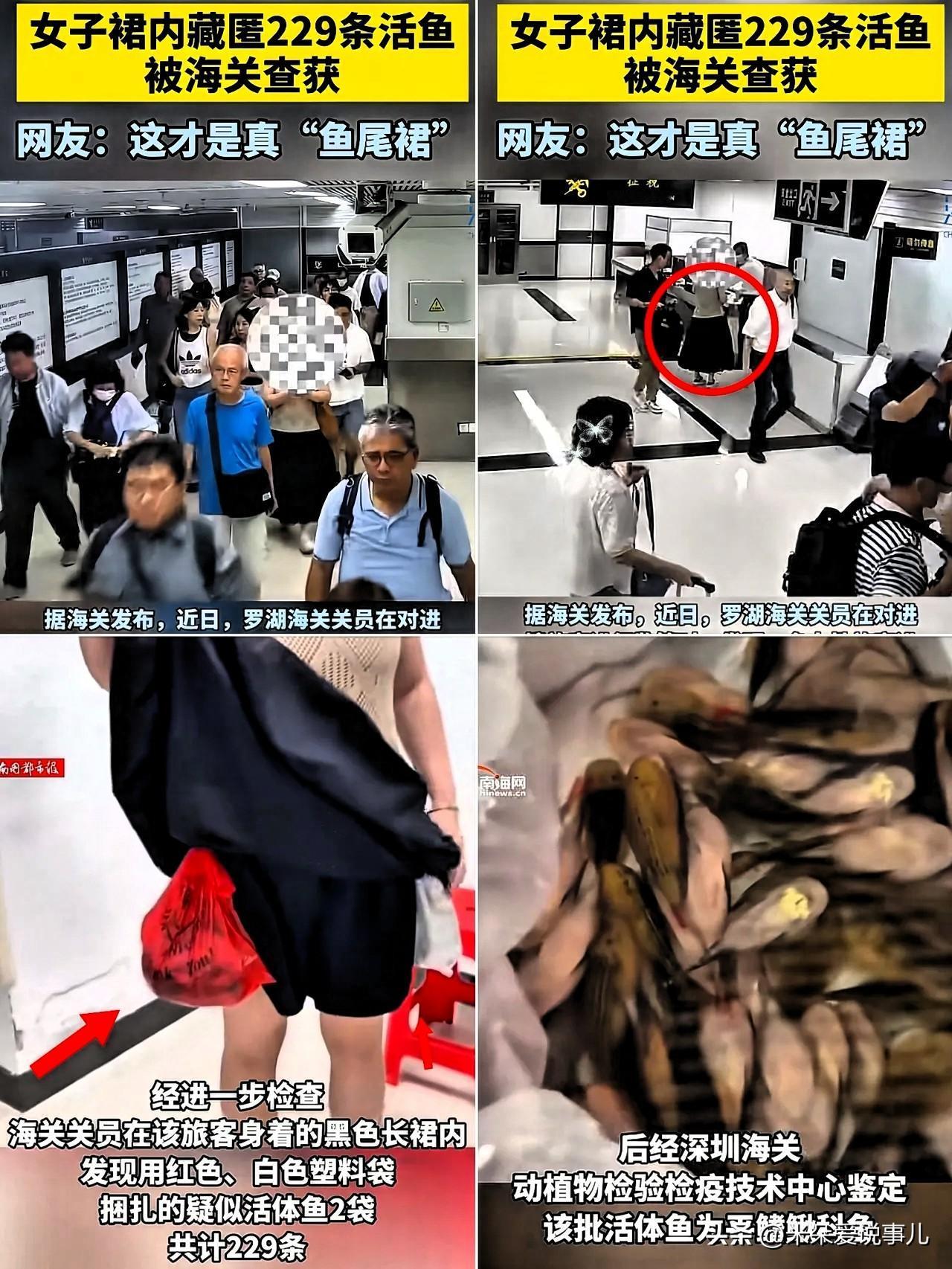 这下出名了, 不仅深圳,全国人民都知道了! 深圳海关女查员识破女的非常规旅客行李,229条平鳍鳅科鱼藏匿于其大腿外侧绑着的两个塑料袋中。 近日,一则女子在深圳海关查出携带229条平鳍鳅科鱼的消息,引发网友热议。 该女子穿着一身黑裙,外表打扮普通,肩挎一褐色包,看似与普通旅客无异,但被海关人员识破。 这名女子到底有何动机,令人好奇。