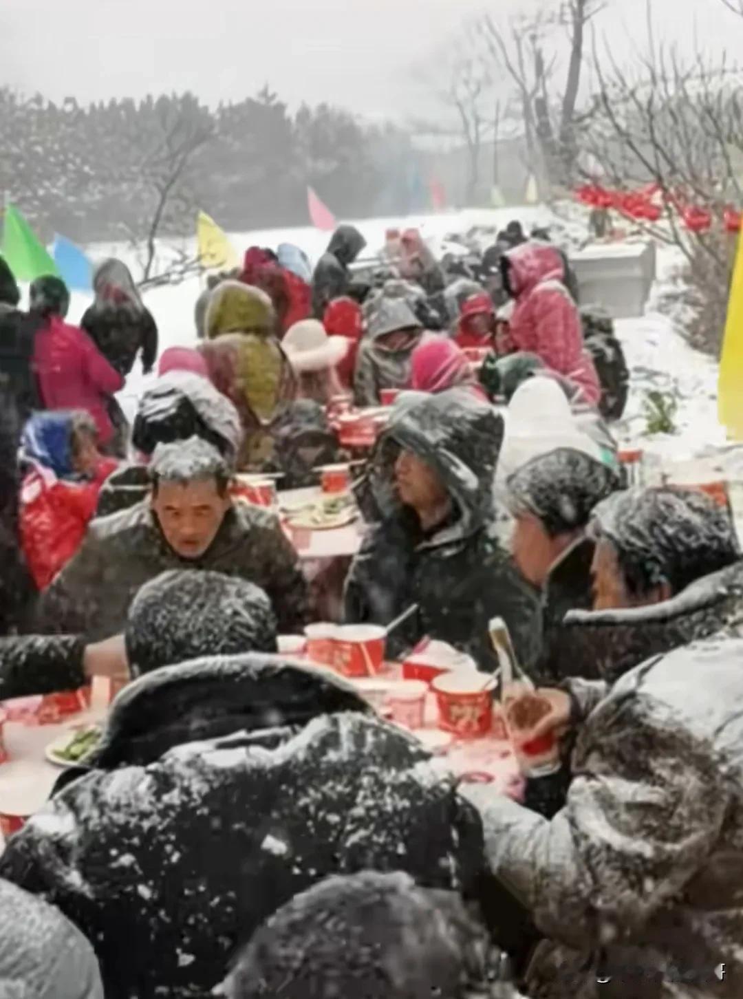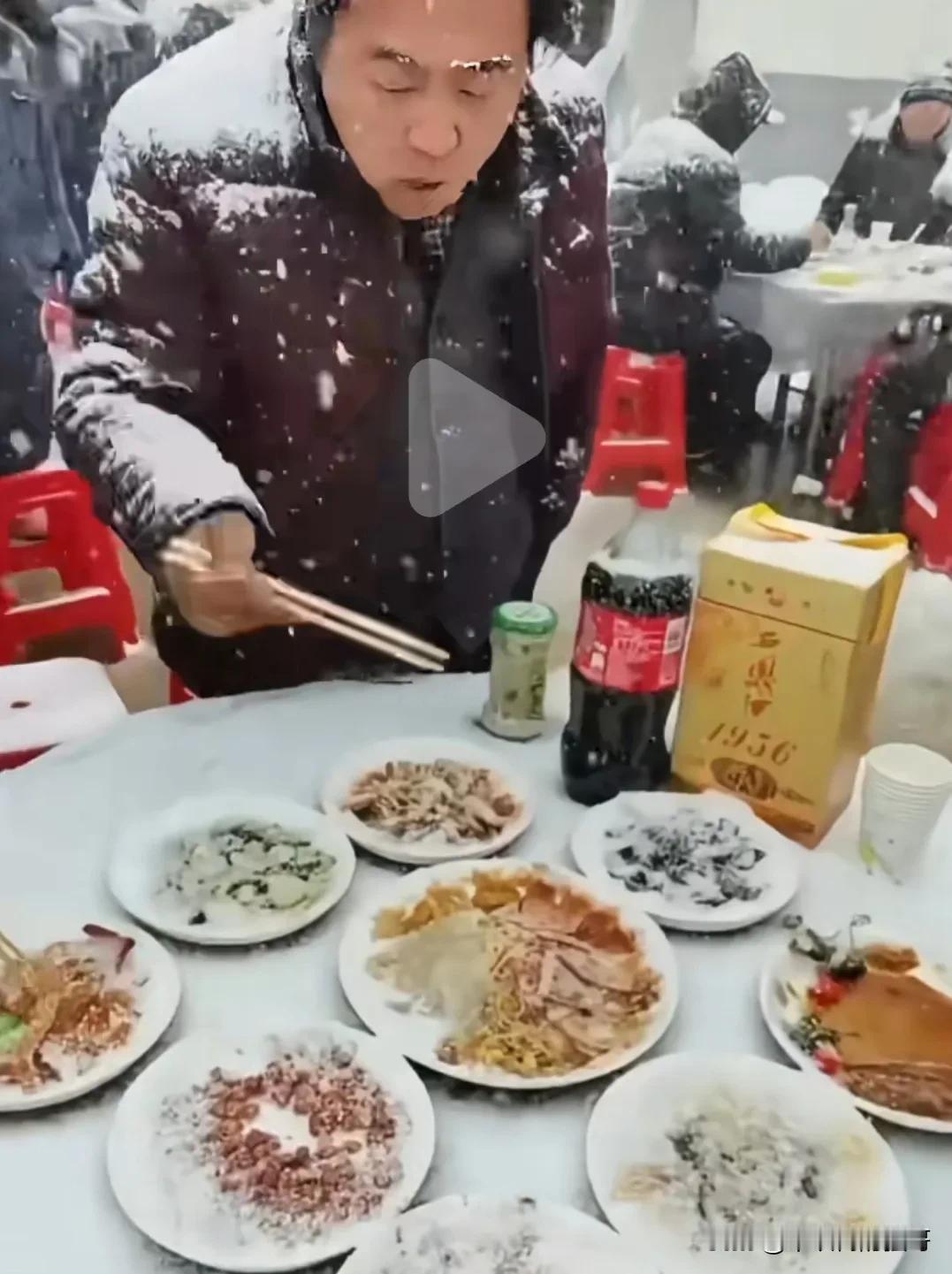 豪横冻人的北方婚礼[笑哭] 一对北方新人举行婚礼,正赶上下大雪,大冬天下大雪,雪中吃凉菜[捂脸] 南方人可能感到奇怪,为啥下雪了不进屋还在外面? 首先,北方人结婚的日子都是看过黄历的,定好了就不再更改,通知也发下去了,农村办婚礼都是院子里摆桌子吃席。 不过,现在我们这都不是这样了,最早是去家里的一条龙服务,现在都是去专门接待婚礼的礼仪城,而城里的就去大酒店了,图片中的场景已经在我这消失很多年了。