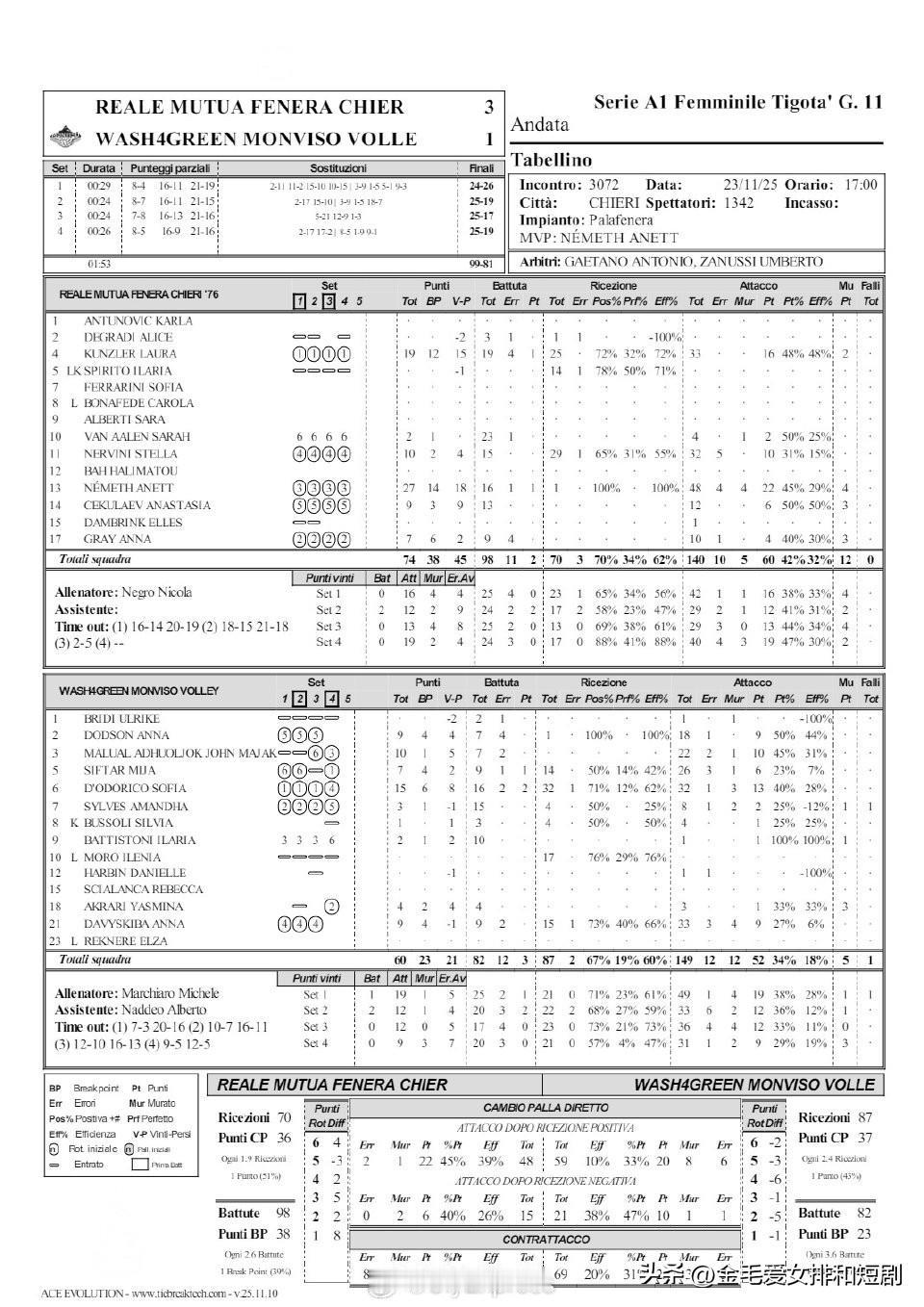 意甲女排基耶里3-1皮内罗洛 贝尔加莫3-2库内奥 11月23日,意甲女排第11轮。基耶里主场3-1(24-26/25-19/25-17/25-19)击败皮内罗洛,MVP内梅斯27分、昆兹勒19分、内尔维尼10分,德奥多里科15分、马鲁亚尔10分;布斯托阿斯奇奥主场3-1(25-21/25-15/18-25/25-9)战胜佩鲁贾;贝尔加莫主场3-2(26-24/25-22/25-27/19-25/15-11)险胜库内奥。