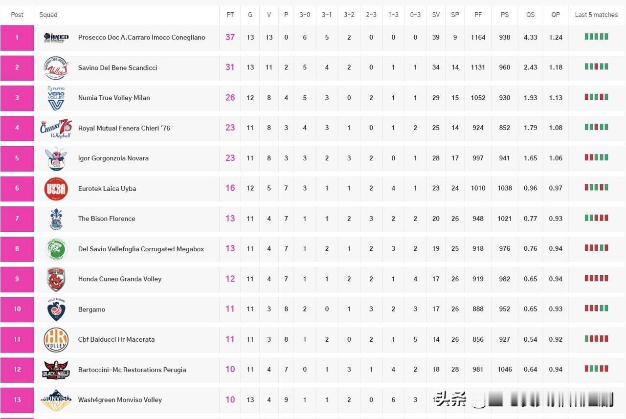 意甲女排最新积分榜 11月23日,意甲女排第11轮结束。科内利亚诺13连胜37分继续遥遥领先,斯坎迪奇11胜2负31分领跑第二集团,少赛一场的米兰8胜4负26分暂列第三,少赛两场的基耶里和诺瓦拉均为8胜3负23分位列四五位;取得第三胜的贝尔加莫从倒数第二升至第十位,圣乔瓦尼继续排名倒数第一。