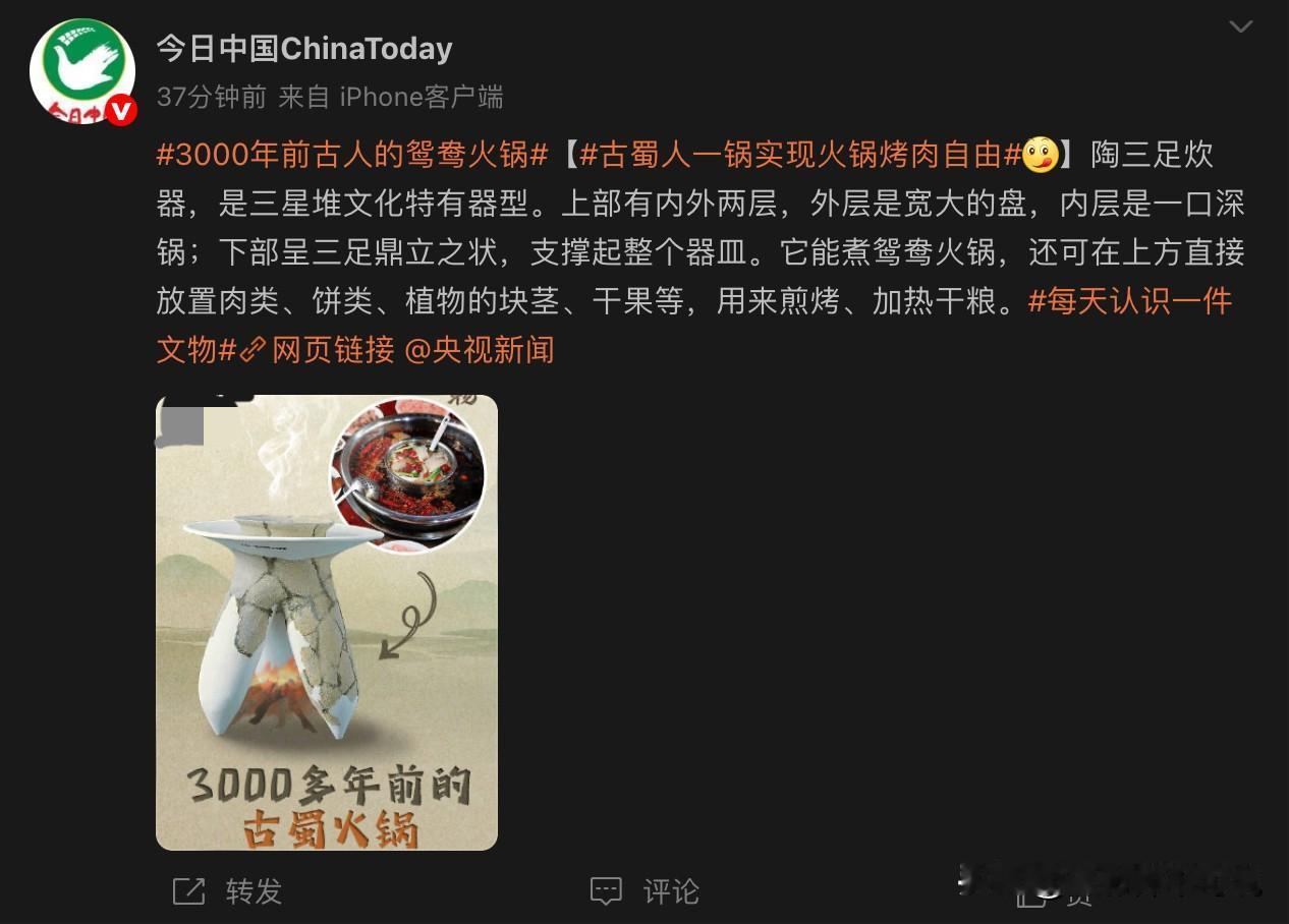 火锅诞生在四川看来不是没有理由的,居然发现了疑似3000多年前的火锅,而且还是鸳鸯锅。这款陶三足炊器的样式非常独特,可以适应古时候烧柴火的需求,而足顶上则是一口类似现代鸳鸯锅的形状的盘子,可以煮着吃也可以烤着吃。由此可见,古人的智慧远远超出了咱们的想象,不过这玩意儿在3000多年前可能不会便宜,一般人还真可能用不起。