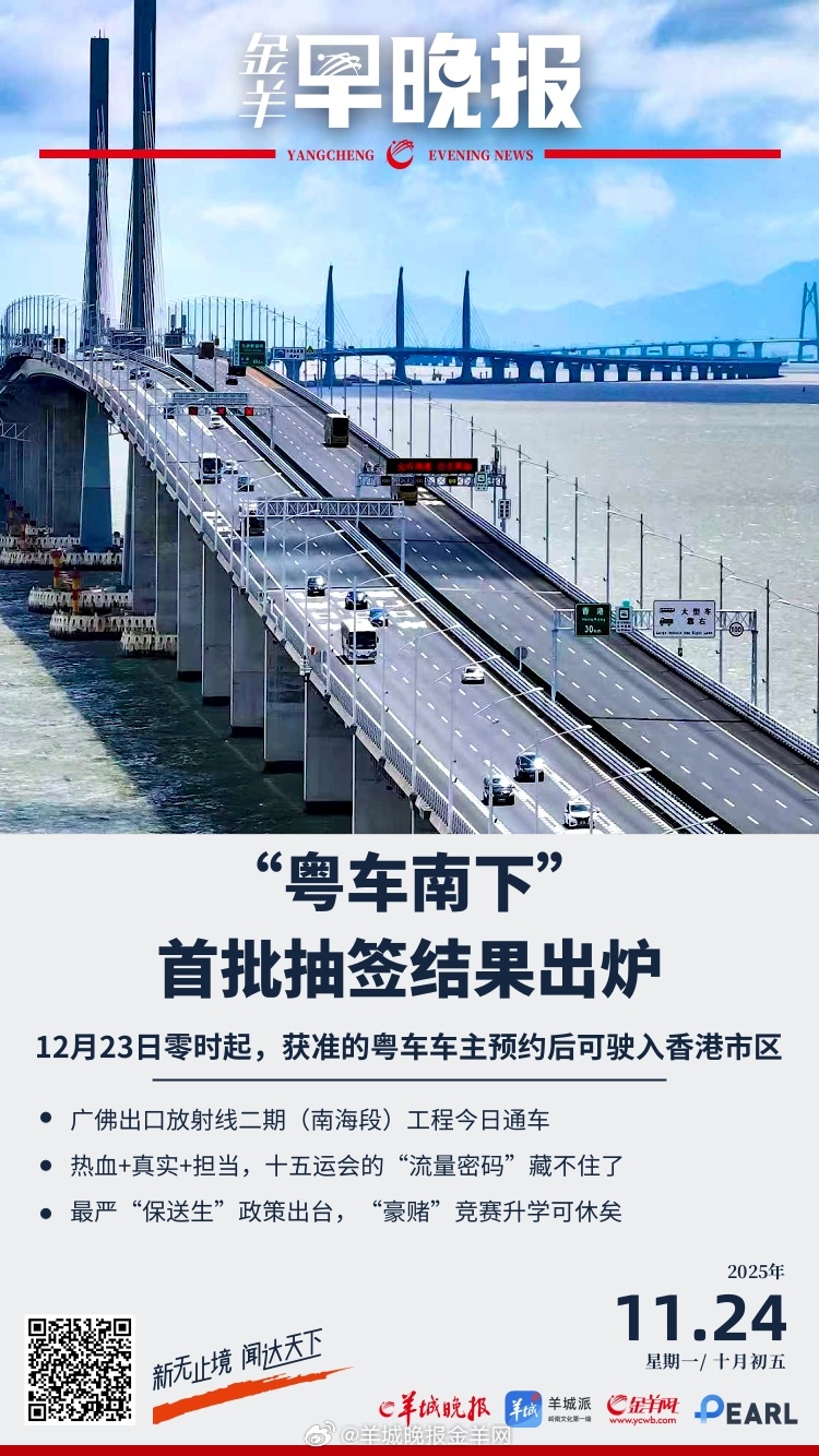 下个月,开粤车到香港!“粤车南下”首批抽签结果出炉;最严“保送生”政策出台,“豪赌”竞赛升学可休矣;9.9元体验“偷”甘蔗爆火,现场有NPC巡逻“抓捕”!由于夜晚人太多,老板尝试“劝退”;男子向碗里放腋毛“碰瓷”餐馆,店家上传监控视频引热议,最新处理结果;涉毒艺人直播被网友举报;佛山⇄广州荔湾,5分钟直达!广佛出口放射线二期(南海段)工程24日通车;广州一区通报两起校外培训违法违规典型案例:退费、罚款!热血+真实+担当,十五运会的“流量密码”藏不住了!|定格十五运・回望高光时;利物浦和上赛季的曼城比谁更惨,斯洛特愿意承担责任;广东“乱穿衣”模式持续上线,新一波冷空气已启程;紧急提醒!驻留刚果(金)东部地区中国公民应立即撤离;全球首例!美国报告H5N5型禽流感致人死亡病例;高市早苗在G20峰会迟到近1小时画面曝光。 更多精彩报道,请扫码关注羊晚全媒体报道!