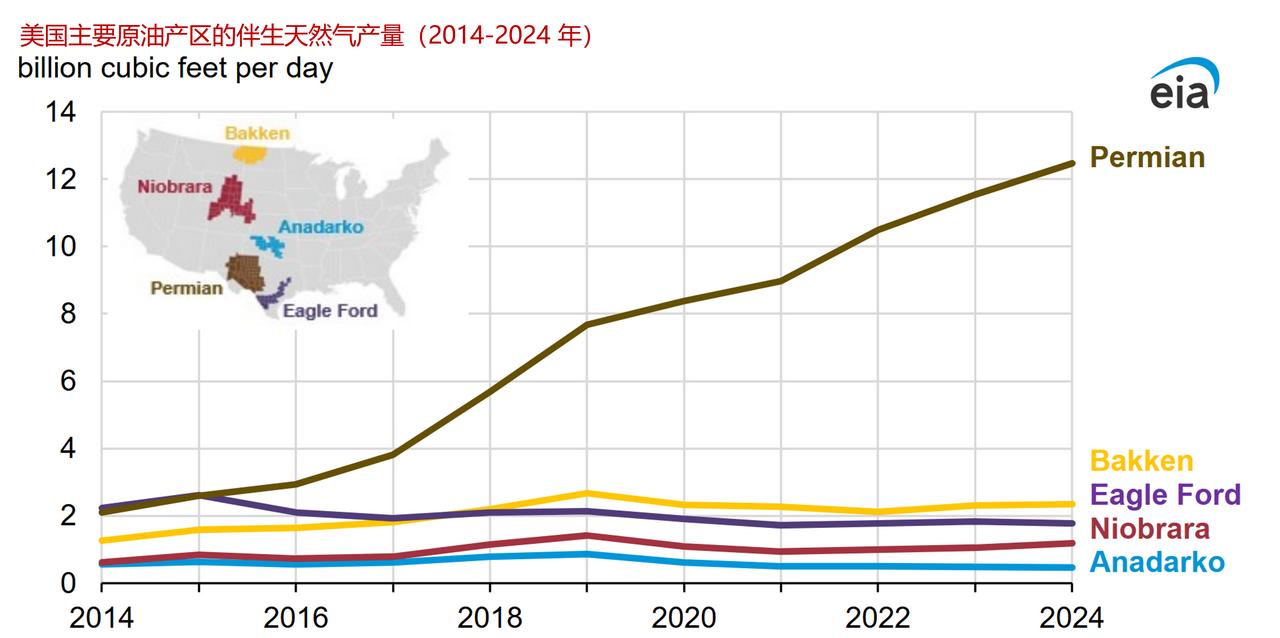 2024年美国的伴生天然气产量增长了6%,主要产自哪里? 伴生气是由主要产