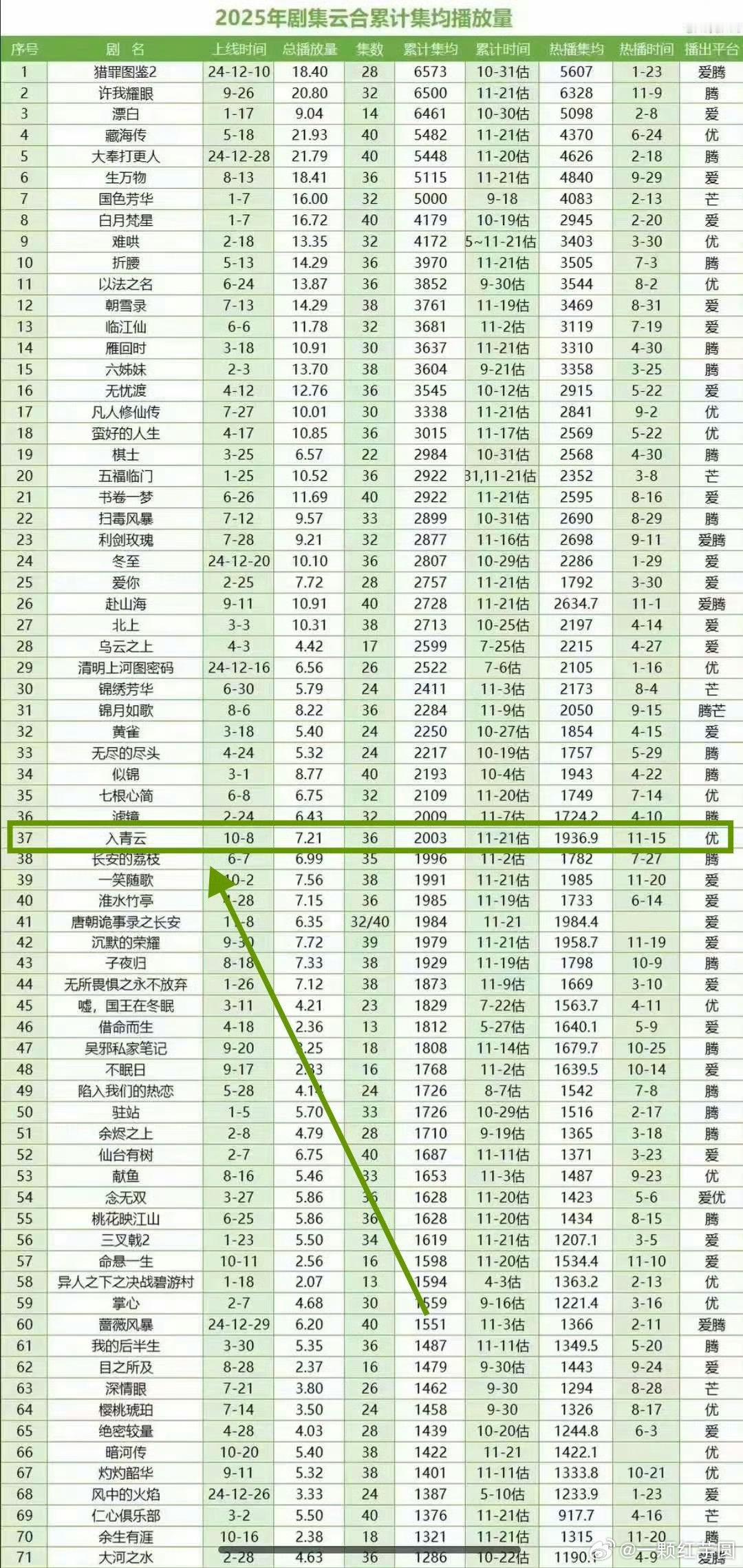 入青云云合累积播放量已破2000侯明昊扛剧口碑好长尾好这个入青云甚至这周末还