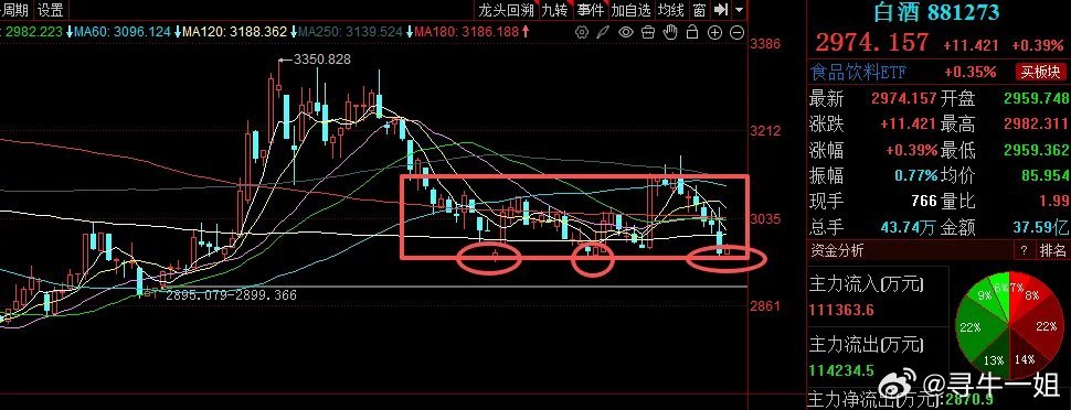 白酒、短期或有强支撑、但中线或将走低!!!今天白酒板块指数呈现小幅上涨态势,板块指数上涨超0.4%,板块内个股也涨多跌少,板块氛围再次受到比较大的打压。在11.10号白酒大涨的时候给大家分析写到:“白酒虽然大涨,但更多的是外因刺激,而外因刺激的利好一旦过去,还将会吐出去涨幅的。对白酒也是长期不看好”,从近期白酒持续走低来看还是符合预期的。今天白酒小幅反弹,主要是因为前期白酒持续下跌,短期内积累了较大跌幅,所以今天白酒走的超跌反弹的逻辑。上周五和今天白酒再次位置有所止跌,主要是因为今天再次来到了前期的箱体下轨附近,这个位置作为前期的主要支撑位,自然也是目前下跌的强支撑了。从长期来看,白酒还将弱势下跌为主,甚至去刷新前期低点。