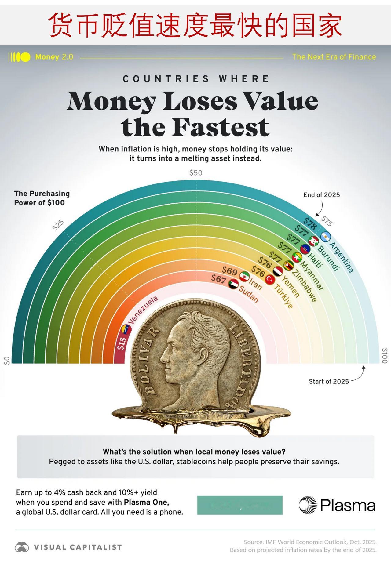 通货膨胀观察:2025 年丧失购买力最多的国家是哪些? 想象一下,当你在 1 月份赚了 100 美元,但到 12 月份,这笔钱却只能购买不到 80 美元的商品或服务。这就是在一些国家,通货膨胀是如何迅速侵蚀人们的购买力的。 这张图表展示了通货膨胀率最高值的国家,并预测了到 2025 年底 100 美元可能的购买力情况。 ——因通货膨胀导致的 100 美元价值的下降 一些国家正面临着高通胀率的局面,这意味着物价正在迅速上涨。随着物价的上涨,现有的货币所能购买到的东西会比之前更少。 那么,以美元计算的话,情况又是怎样的呢?我们依据国际货币基金组织(IMF)所预测的 2025 年通货膨胀率,计算出了年初 100 美元到 2025 年年底的价值。 国际货币基金组织预计,到 2025 年,委内瑞拉的通货膨胀率将高达近 549%。从实际角度来看,年初存下的 100 美元到 12 月时只能买到价值 15 美元的商品。美国实施的经济制裁加剧了该国的金融危机。 即便撇开这个极端的例子不谈,许多国家今年的货币实际购买力预计都将下降约四分之一。这意味着工资和储蓄会迅速贬值,从而使得诸如食品和房租等日常生活必需品变得更加难以负担。