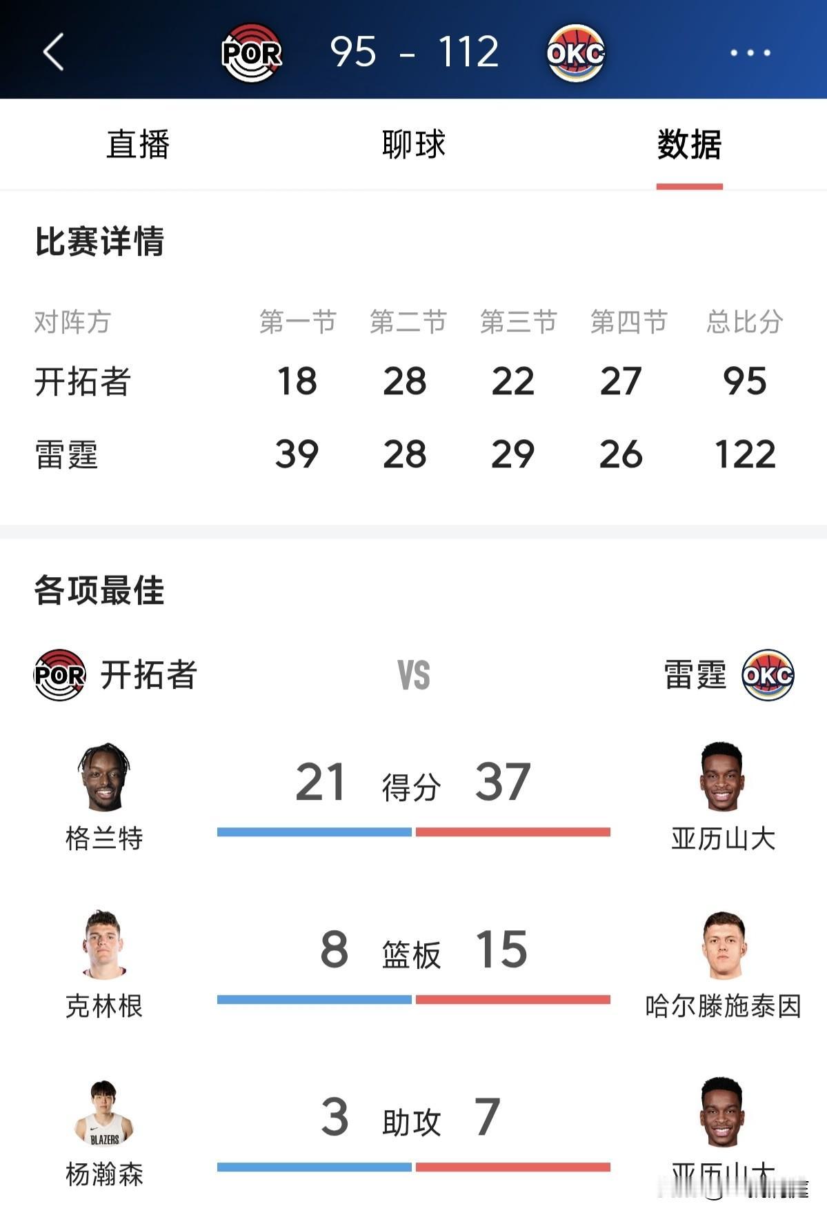 杨瀚森11投3中送雷霆9连胜,亚历山大37分再次躺赢!杨三次助攻居然是球队最高。 北京时间11月24日,雷霆主场122比95大胜开拓者,雷霆在首节都赢21分直接让后面三节变成垃圾时间,亚历山大拿到37分7助攻5篮板。中国球员杨瀚森出场17分钟,拿到8分4篮板3助攻1抢断1盖帽。今天三分球6中1,要是命中率提高点得分就上双了。