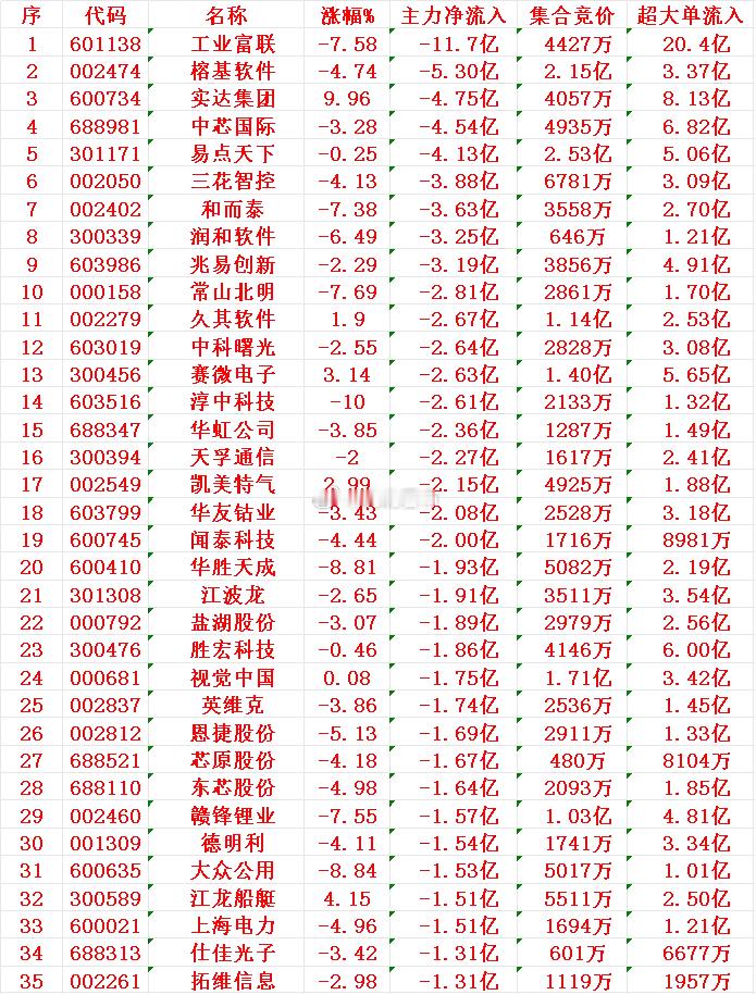 11月24日开盘45分钟,主力资金“卖出的 ”35名单!工业富联:净流入为 -11.7 亿元榕基软件:净流入为 -5.30 亿元实达集团:净流入为 -4.75 亿元中芯国际:净流入为 -4.54 亿元易点天下:净流入为 -4.13 亿元