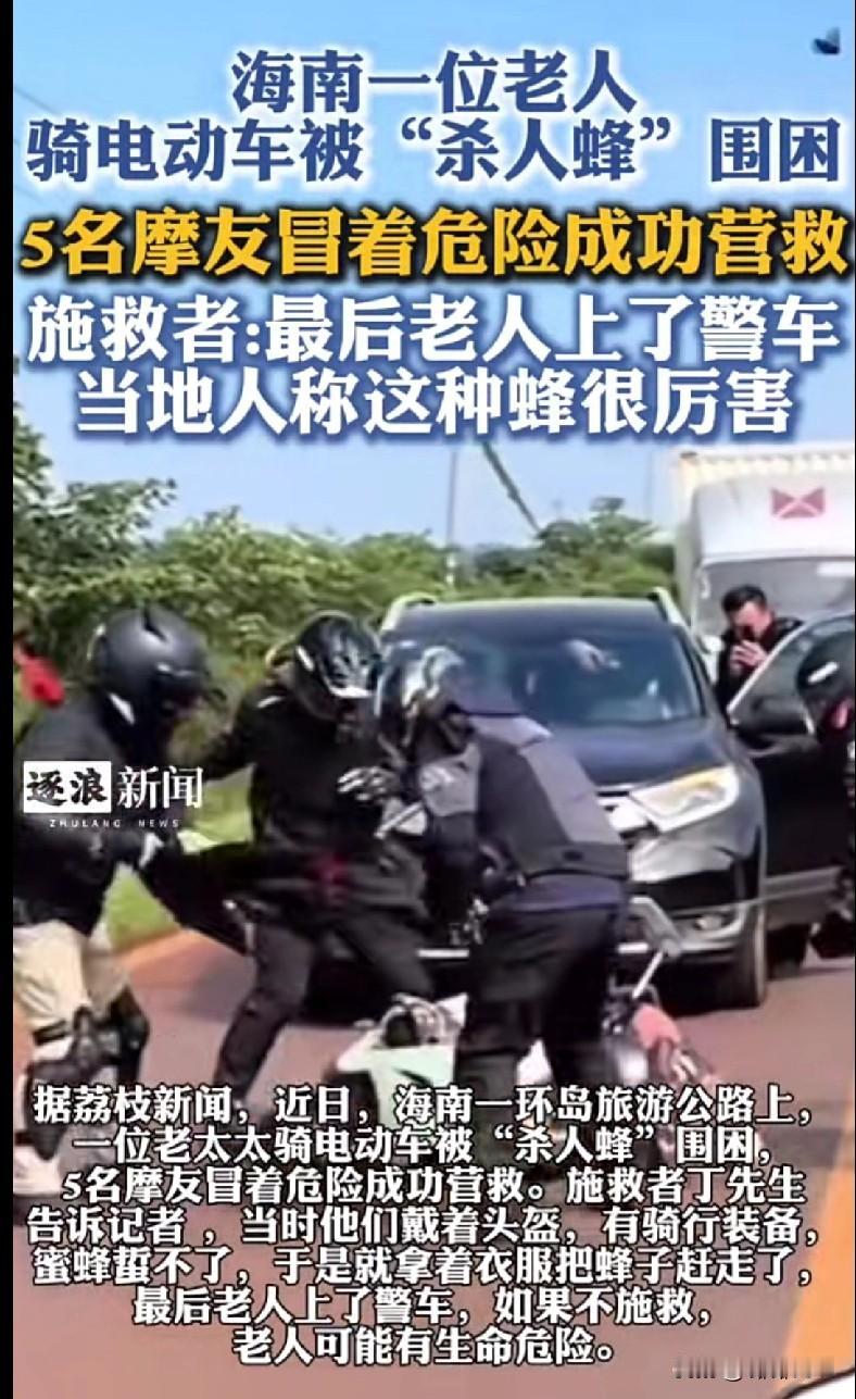 海南环岛公路这事儿太暖了!昨天刷到一老太太骑电动车被“杀人蜂”围了,那蜂当地人说巨凶,蛰一下能要命! 正危急呢,5个摩友直接冲上去了——人家戴着头盔穿骑行服,蜜蜂蛰不透,抄起衣服就把蜂子往旁边赶,硬生生把老人从蜂群里拽出来了! 后来老人被警车接走,救人事后说“当时没想别的,就怕晚一步老人出事”。 真的,平时总刷到说骑摩托的咋咋,这波直接给摩友圈长脸!头盔护具今儿不光护自己,还成了救人的“铠甲”! 咱就是说,这才是普通人里的英雄吧?顺手的事儿,救了条命,这波必须给摩友们点一万个赞!