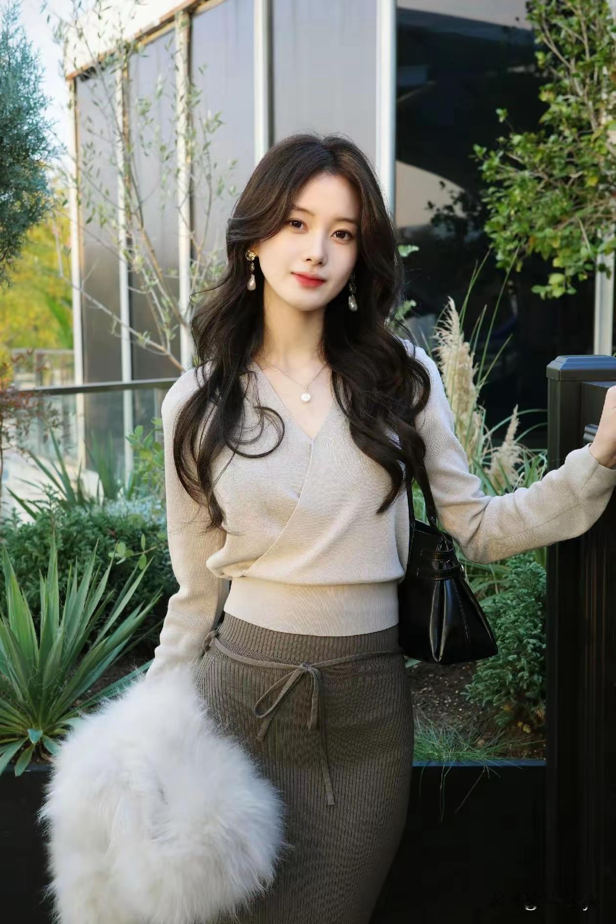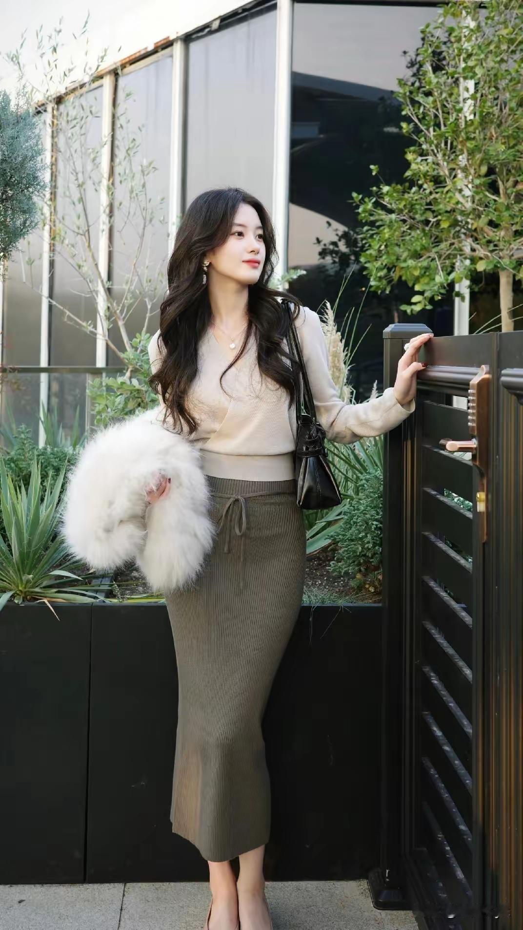 优雅气质穿搭,米色毛衣+灰绿色半身裙,手拿毛绒包,都市时尚感满满!👗👠💄漂