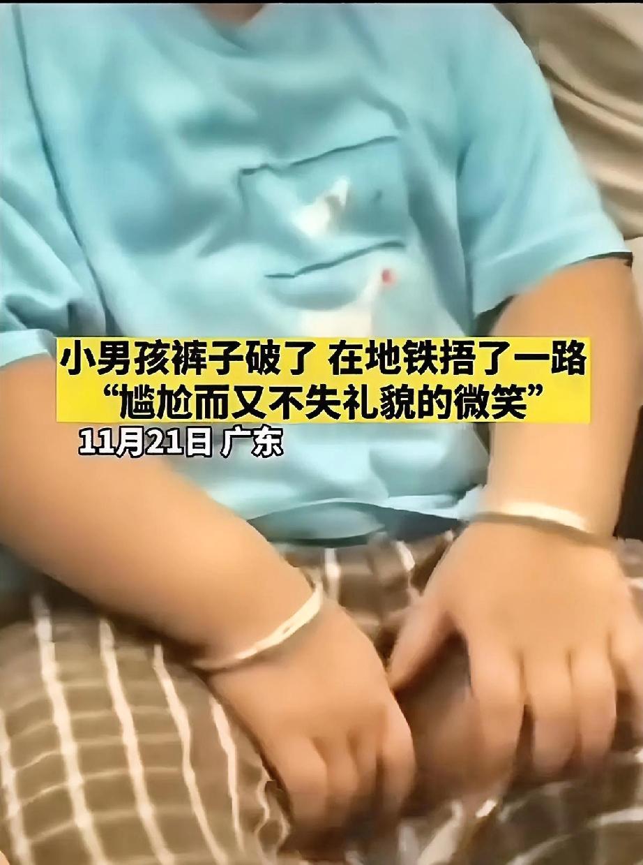 广东地铁上的这个小男孩,发现自己的裤子破了。他既没哭闹也没慌张,而是用小手默默捂了一路,脸上还挂着那副“尴尬又不失礼貌”的微笑。 这孩子太懂事了!明明心里慌得不行,却还努力保持着小男子汉的体面。这个强装镇定的模样,像极了每个成年人小时候遇到糗事时的样子。 小朋友,没关系,谁小时候没经历过几条破裤子呢?你这份临危不乱的气质,已经赢过很多人啦!