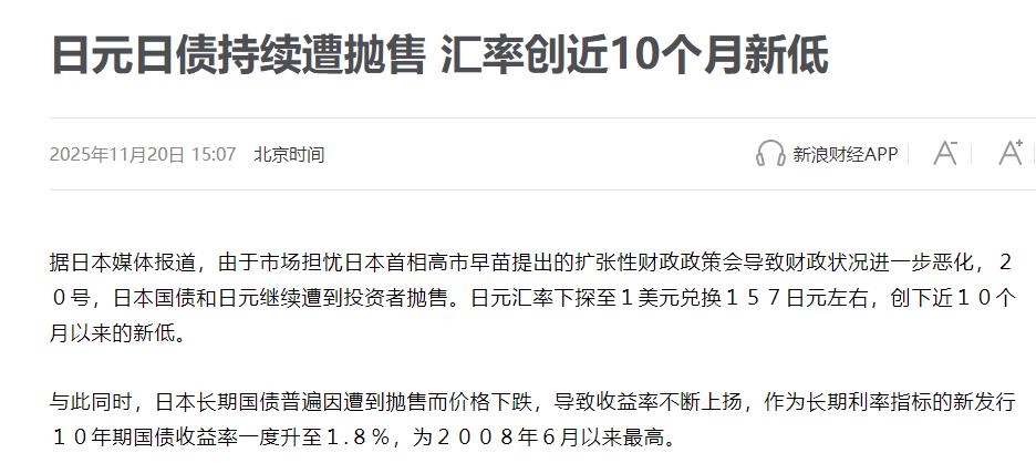 日本遭遇双杀!高市早苗又迎来噩耗。 11月22日,日本当地媒体在报道中称,不仅日元汇率下跌、创下近10个月以来的新低、金融市场遭遇动荡,而且日本国债正在遭遇大规模的抛售。 高市早苗一上台,满脑子都想靠“撒钱”把经济拉起来。她刚推出的财政刺激计划,规模直接搞到21.3万亿日元,差不多合9610亿人民币,这可是自从新冠疫情之后,日本花钱最狠的一次,比市场预想的多太多了。她本来想靠这笔钱给经济打打气,没想到先把市场给吓着了,日本政府本来欠的债就够吓人的,这么大规模砸钱,财政状况不就更完蛋了吗? 最先表态不买账的是外汇市场。11月19日纽约那边交易的时候,日元兑美元一度跌到1美元换157.18日元,这是今年1月以来头一回跌破157。等东京市场开盘,汇率直接就停在157上下浮动。 更糟的是兑欧元,直接跌到1欧元换181日元,创下历史最低,手里的日元不管换啥都不值钱了。偏偏这时候美联储又说,降息得往后拖,投资者干脆把日元抛了买美元,硬是把日元汇率往死里压。 国债市场的日子更不好过。以前日本国债还有央行兜底接盘,现在央行自己都在慢慢减少持有的国债量,今年以来长期国债的持有量已经降了2.2%。这个手里攥着576.6万亿日元国债的“大买家”都在往后缩,新发行的国债自然没人愿意要。 10年期国债的收益率冲到了几十年的高位,30年期的更夸张,从月初的3%一下子涨到3.35%以上。收益率越涨,说明国债越不值钱,抛售潮紧跟着就来了。 德意志银行早就拉响警报了,说现在这情况跟2022年英国的“特拉斯风暴”特别像,当时特拉斯也是靠猛花钱的财政计划,把本国国债市场搞崩了。银行专家说得很实在,要是市场对日本政府和央行彻底没信心了,谁还会买日本国债? 到时候钱都往外跑拦不住,麻烦就大了。要知道日本国债的主要买家都是本土机构,央行占了52%,寿险公司占13.4%,银行占9.8%,外资才占6.4%。连自己人都开始抛售,这信号有多危险,不用多说也明白。 高市早苗的麻烦还不止这些。日元贬值看着好像能帮到出口企业,但日本几乎啥东西都靠进口,能源、粮食这些价格都跟着美元在涨,日元一跌,等于进口成本直接往上涨。老百姓手里的钱越来越不值钱,超市货架上的东西一天一个价,刚盼来的经济刺激,转头就被涨价给抵消没了。 现在日本央行也犯了难:出手稳住汇率吧,手里的外汇储备顶不住;收紧货币政策稳住国债吧,又怕把刚有点好转的经济再拽回去。而这事儿的源头高市早苗,本来想靠“大撒币”刷点政绩,结果把金融市场搅得一团糟。这波“双杀”也算给她上了一课,经济发展不是砸钱就能搞定的,急着出成绩的政策,早晚得被市场报复回来。