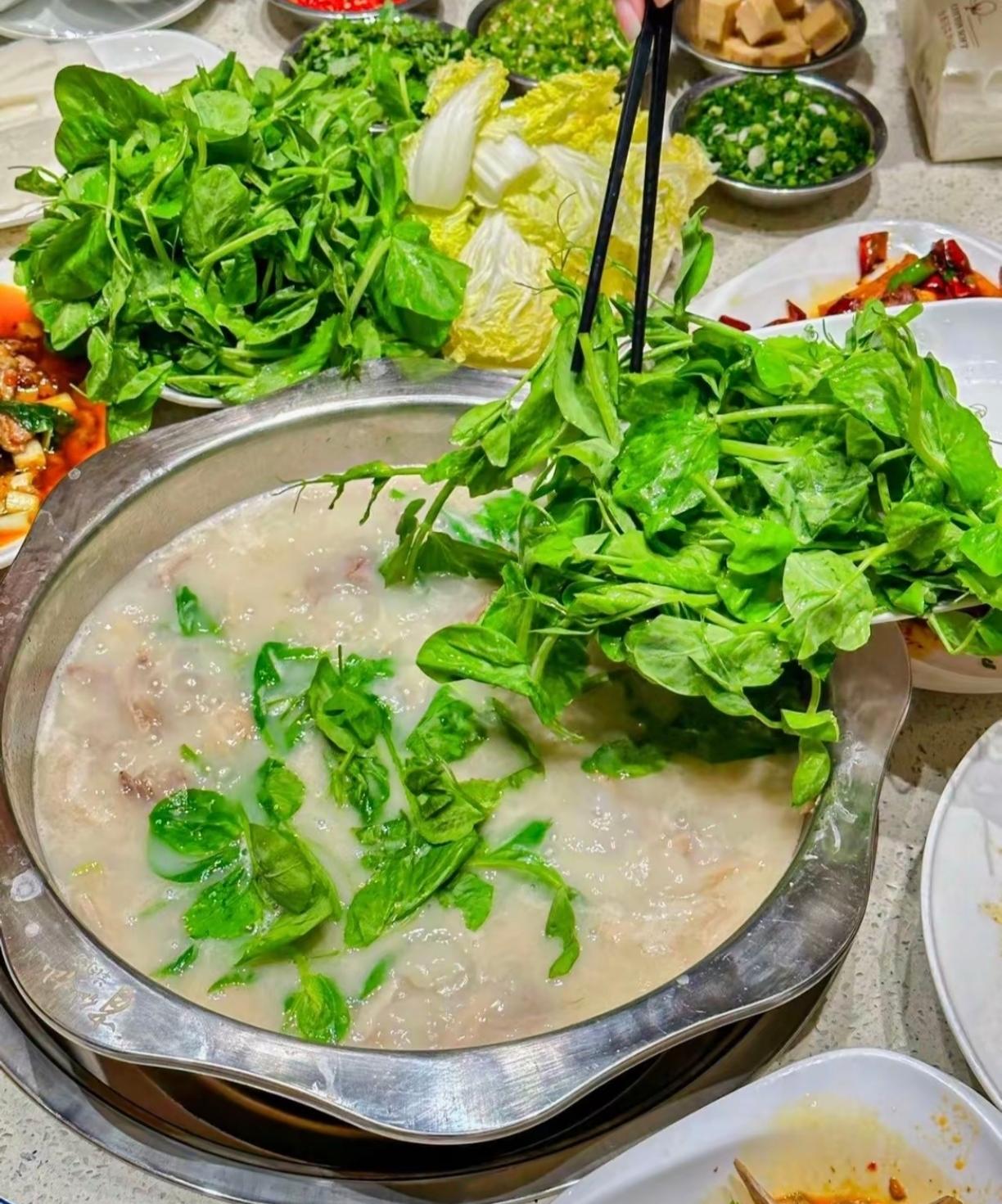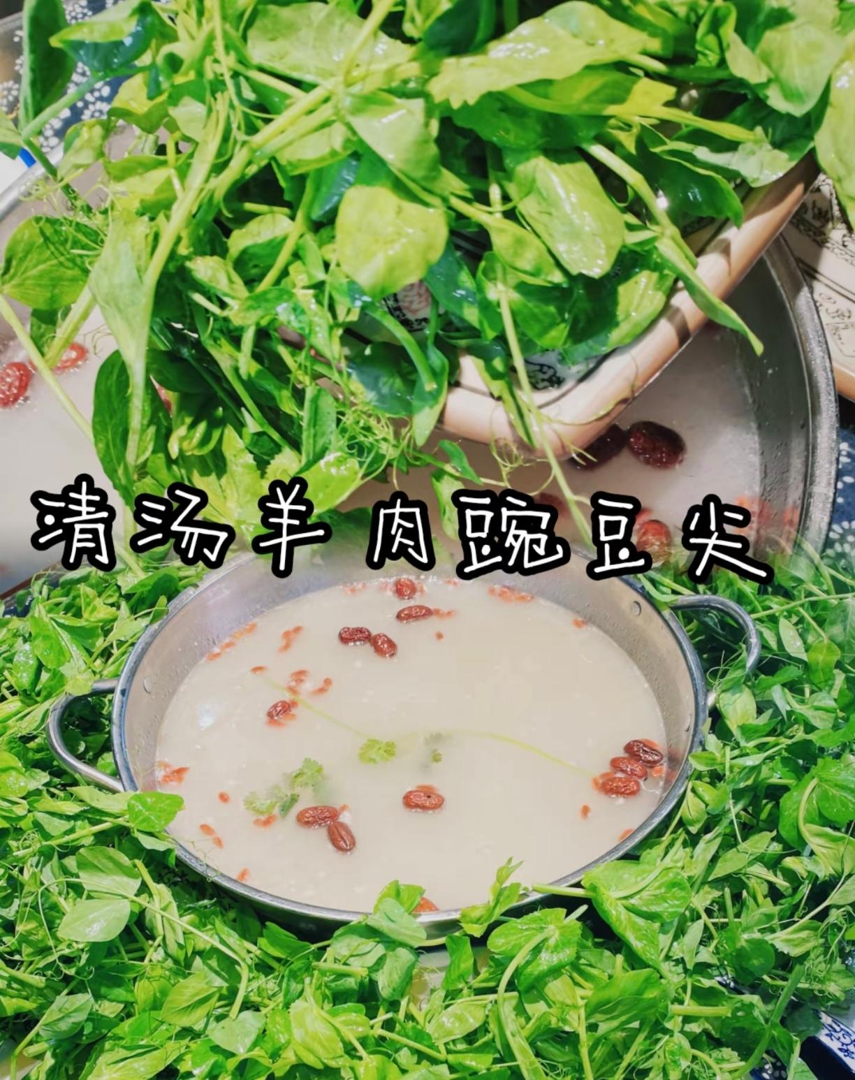 川渝的冬天,羊肉汤配豌豆尖是最经典饮食搭配。 羊肉汤汤色乳白、味道醇厚,而豌豆尖带有独特的清甜和脆嫩口感,能有效中和汤中的油脂,避免油腻感。 羊肉富含蛋白质和热量,适合驱寒;豌豆尖则提供维生素和膳食纤维,实现荤素平衡,符合健康饮食理念。