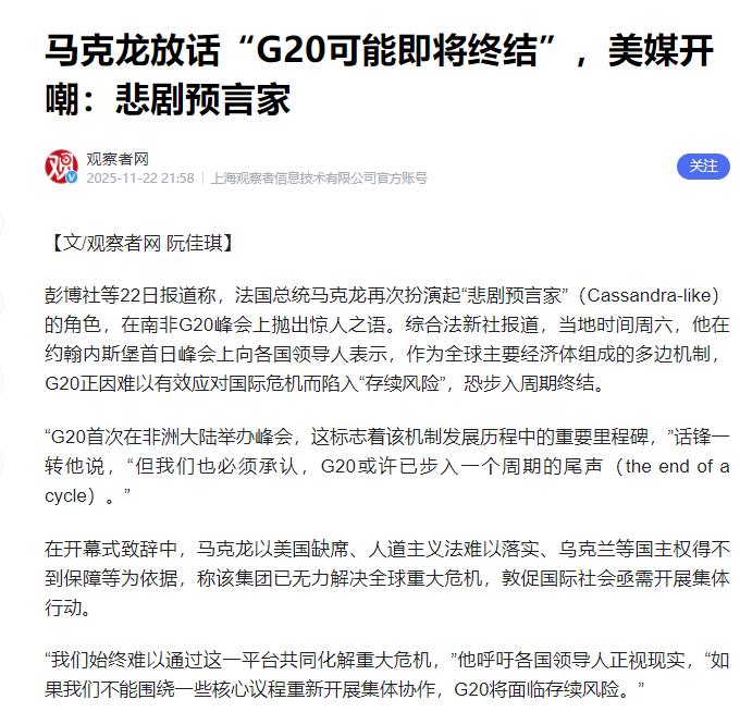 11 月 22 日南非约翰内斯堡 G20 峰会首日,马克龙发出强烈警告! 马克龙直言:“G20 或许已步入周期尾声!” 不过,这位曾预言北约 “脑死亡” 的法国总统,再次以 “悲剧预言家” 姿态断言多边机制失灵。 然而戏剧性的是,峰会当天即通过 122 条联合宣言,甚至未纳入美国意见。 美媒嘲讽称,马克龙的 “末日论” 恰似重演 2019 年的北约预言,如今 G20 用行动证明,没有霸权国家的阻挠,多边合作反而迸发出更强生命力。 这场被预言为 “终结” 的峰会,最终成为全球南方崛起的里程碑,也让马克龙的预言陷入尴尬境地。 不过,可以确定的是,马克龙对G20的存续隐忧绝非空穴来风。作为“自我遴选”的集团,其成员资格缺乏透明标准,合法性长期受质疑。 尽管覆盖全球85%GDP和67%人口,但非洲仅南非为正式成员,非盟要到2025年才以“共同代表”加入。 这种代表性失衡让非洲国家的关键矿产开发、气候融资等诉求长期边缘化,而决策层面沿用的G7共识原则,更是让单个国家就能否决提案,此前美国就多次阻挠债务减免协议。 颇具讽刺的是,本次美国缺席后,峰会反而“开幕即定调”快速通过宣言,印证了霸权国家成为障碍时,机制“去霸权化”可能加速的判断。 峰会更标志着全球治理格局的转折。东道主南非以“团结、平等、可持续”为主题,推动G20首次将非洲工业化、灾害风险应对纳入核心议程,宣言中的“关键矿产框架”直接回应了非洲价值链升级诉求。 中国提出的500亿美元非洲现代化基建倡议,与非盟《2063愿景》战略对接,彰显南南合作新动能。 更值得关注的是,宣言起草未纳入美国意见,气候变化议题也顶住美方反对被坚持写入。 这种“去美国化”模式,折射出新兴经济体与发展中国家正在形成新合作网络,印度《经济时报》直言,美国缺席反而“扫清了共识障碍”。 马克龙的预言背后藏着法国的战略考量。作为欧盟核心,法国试图借G20推动“新多边主义”,既维护西方价值观,又平衡新兴国家崛起。 峰会期间法德意联合声明反对武力变更边界,与美国“乌克兰和平方案”形成对冲,既呼应欧盟战略自主,也为法国2024年任欧盟轮值主席国积累资本。 而美欧裂痕也在扩大,美国施压南非禁发宣言的单边行径遭欧盟批评,法国与中国就气候融资、数字治理达成共识的互动,更凸显多边主义已成为大国影响力竞逐的新战场。 但峰会成果落地仍面临多重挑战。债务治理方面,G20虽通过相关宣言,但2020年巴基斯坦18亿美元减债因披露信息触发信用评级下调、融资成本上升的“减债悖论”,警示改革需更系统。 气候行动上,“2030年可再生能源装机增三倍”的目标需数万亿美元年投入,而发达国家气候融资缺口多年未补,非洲“灾害风险减少原则”也缺乏资金与技术支撑,若无法破解这些矛盾,G20恐陷入“宣言政治”。 马克龙的预言虽显悲观,但G20确实站在十字路口。本次峰会证明,多边机制的生命力不在于霸权参与,而在于回应时代需求。非洲崛起、全球南方联合与美欧关系重构,正在重塑其权力版图。 未来,唯有建立更包容的决策机制、完善共识转化路径、平衡各国利益诉求,才能让G20走得更远。 正如拉马福萨所言,“分歧不能阻碍合作,共识终将引领世界前行”,这正是多边主义的核心要义。
