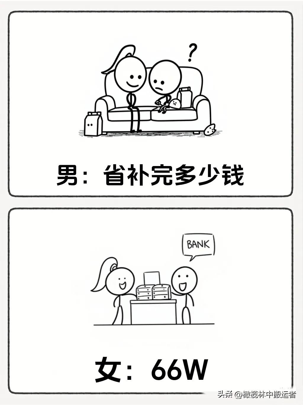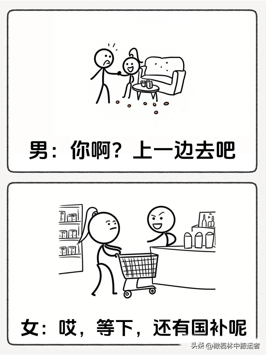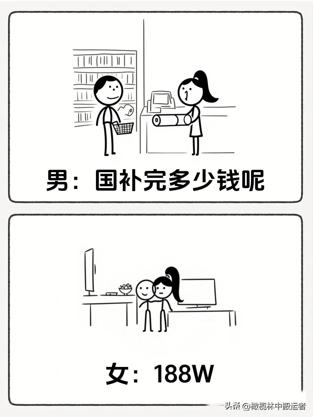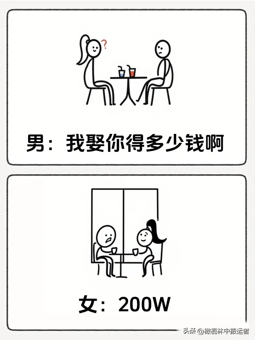 趣味漫画:男:我娶你得多少钱啊?女:200W。男:你啊?上一边去吧。女:哎,等下,还有国补呢。男:国补完多少钱?女:…