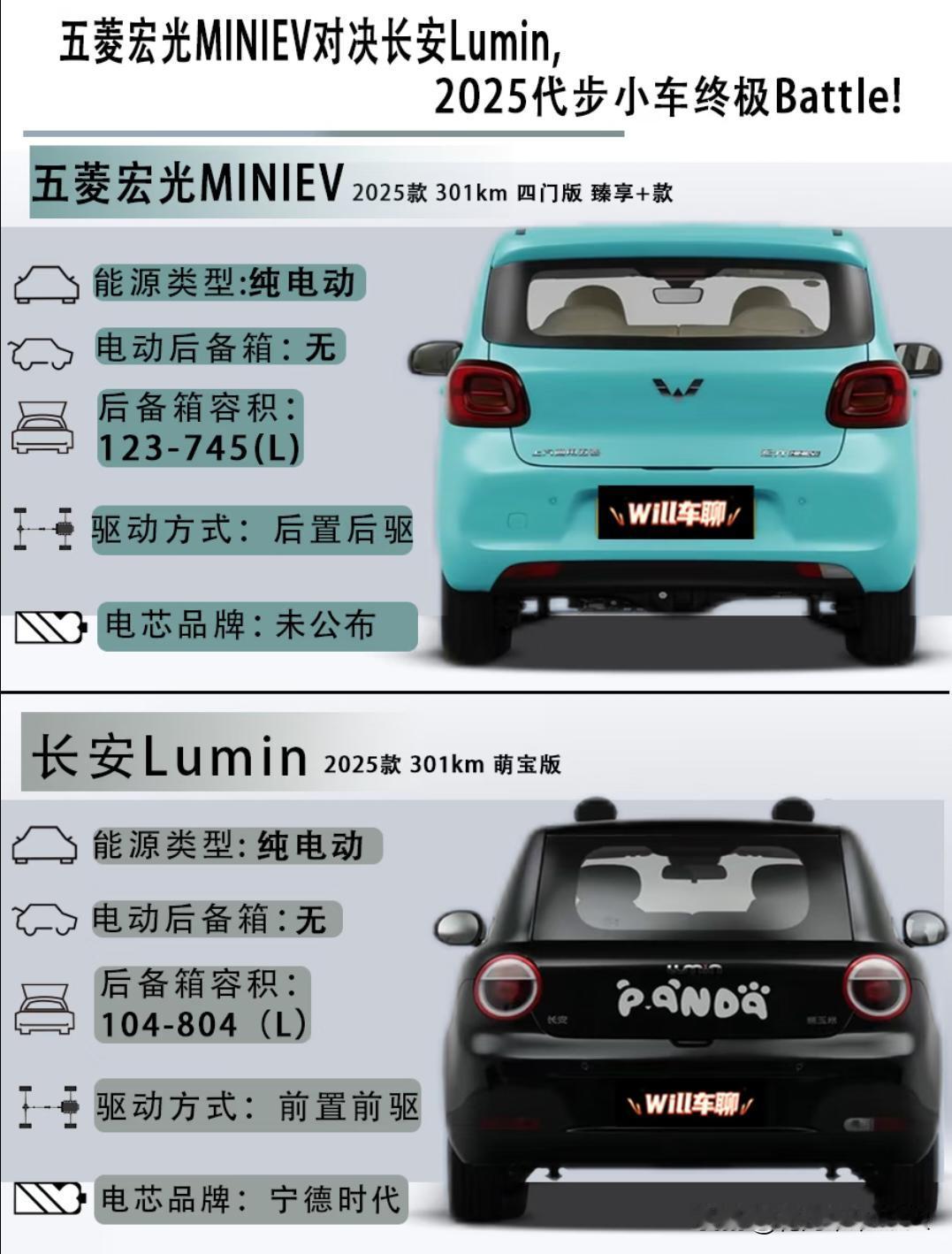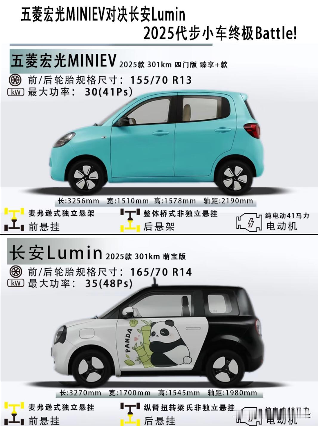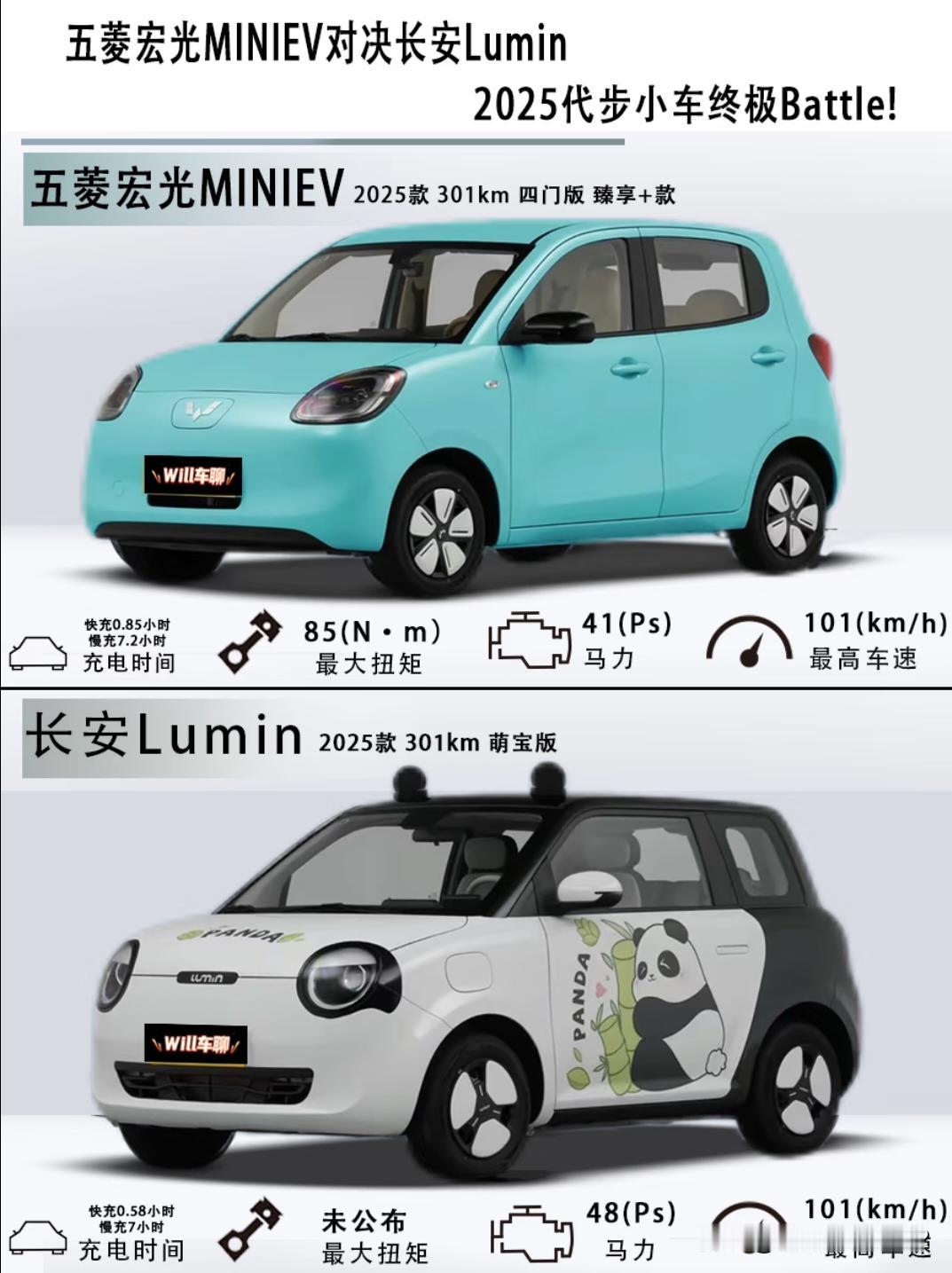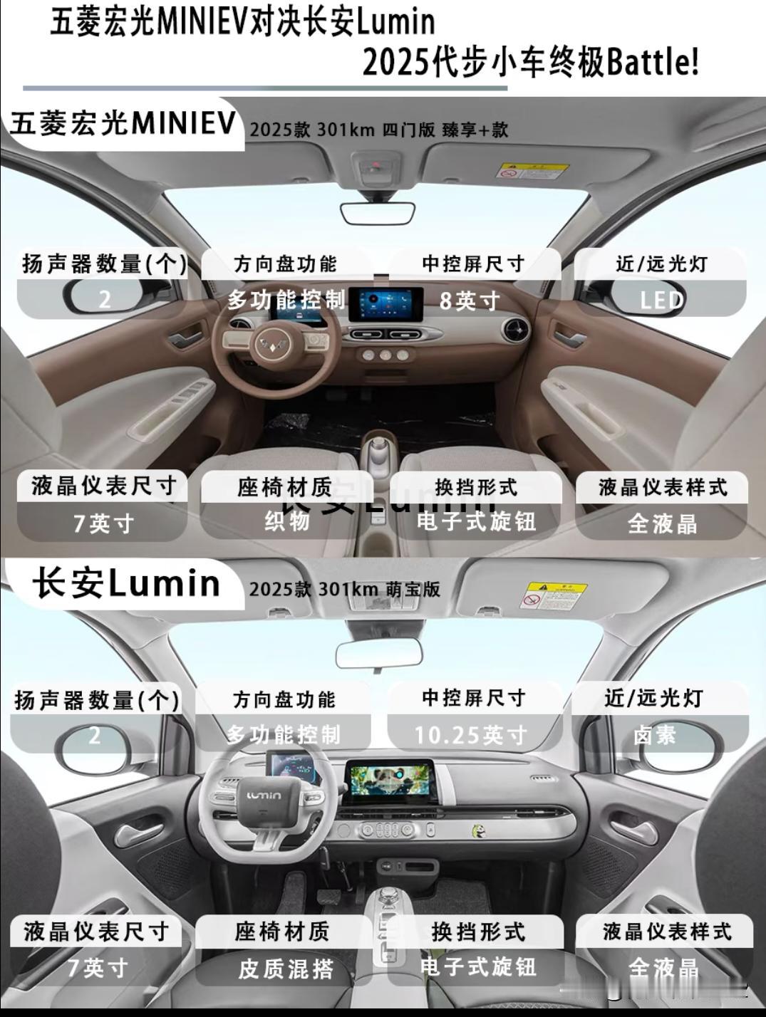 五菱宏光/长安,2025代步小车终极Battle! 在拥挤的城市中,微型纯电车已成为通勤代步的“最优解”。作为该领域的两位顶尖选手,五菱宏光MINIEV与长安Lumin的竞争从未停止! 今天我们就聚焦它们的301km长续航版本,用数据说话——看看谁才是你都市生活的完美拍档? 价格💰 · 五菱宏光MINIEV 301km 四门版 臻享+款:经销商报价约5.58万元。(以下车型简称为五菱宏光) · 长安Lumin 301km 萌宝版:经销商报价约5.69万元。(以下车型简称为长安) 🚗 外观与空间方面 · 五菱宏光:车身尺寸3256×1510×1578mm,轴距为2190mm。行李仓容积为123-745L。外观是经典的“方盒子”造型,线条硬朗,辨识度极高。新增的配色和细节装饰让它多了几分潮玩气息,像一个大玩具。 · 长安:车身尺寸3270×1700×1545mm,轴距为1980mm。行李仓容积为104-804L。圆润饱满的“大眼睛”灯组和柔和线条,让它看起来更像一个“萌系生物”,整体风格可爱复古。 ⚡ 动力与续航方面 · 五菱宏光:搭载总功率30kW的电机,CLTC纯电续航301km。30kW(41马力)+85N·m,快充0.85h/慢充7.2h。后置后驱,市区钻缝贼灵活,能耗9.2kWh/100km更省电。 · 长安:搭载总功率35kW的电机,CLTC纯电续航同样为301km。35kW(48马力),快充0.58h/慢充7h。马力略高,快充更快,但能耗10.7kWh/100km稍费电。 🤖 科技配置方面 · 五菱宏光:配备彩色液晶仪表盘、两个扬声器、多功能控制方向盘、8英寸中控屏、电子旋钮的换挡形式、等。配置以实用为主,满足基本的安全和娱乐需求。 · 长安:配备10.25英寸触控中控屏、多功能控制方向盘、7英寸液晶仪表、电子旋钮的换挡方式等。配置的大屏是其一大亮点,将车内的科技感和档次感拉满。 ✅ 总结 · 五菱宏光MINIEV:适合追求极致性价比、看重品牌口碑和快充便利性的用户。 它的优势在于价格更低、保有量大、配件丰富,是稳妥可靠的代步首选。 · 长安Lumin:适合对外观颜值、内饰质感和科技配置有更高要求的用户。 它的设计更可爱,内饰更精致,并且提供了同级领先的中控大屏,适合追求时尚和一定娱乐体验的年轻消费者。