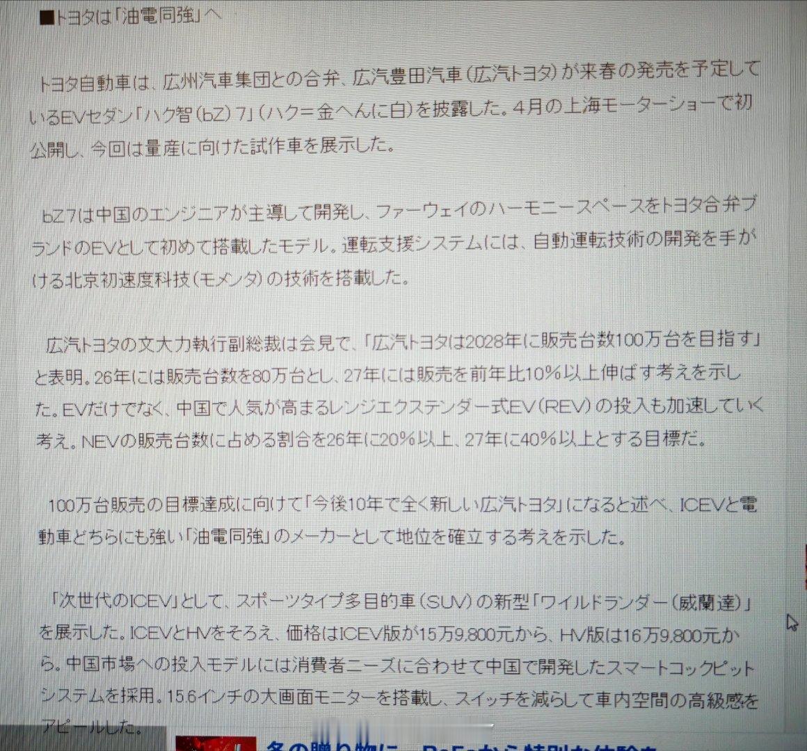 日本也对广州车展丰田的铂智7进行了报道,尤其再智能化上强调了中国技术加持下,智能