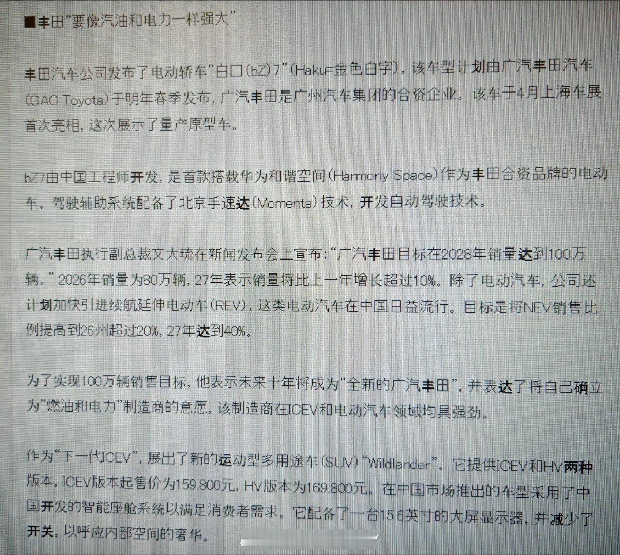 日本也对广州车展丰田的铂智7进行了报道,尤其再智能化上强调了中国技术加持下,智能座舱和辅助驾驶提升明显,我想这就是合资的新模式,强强联合。