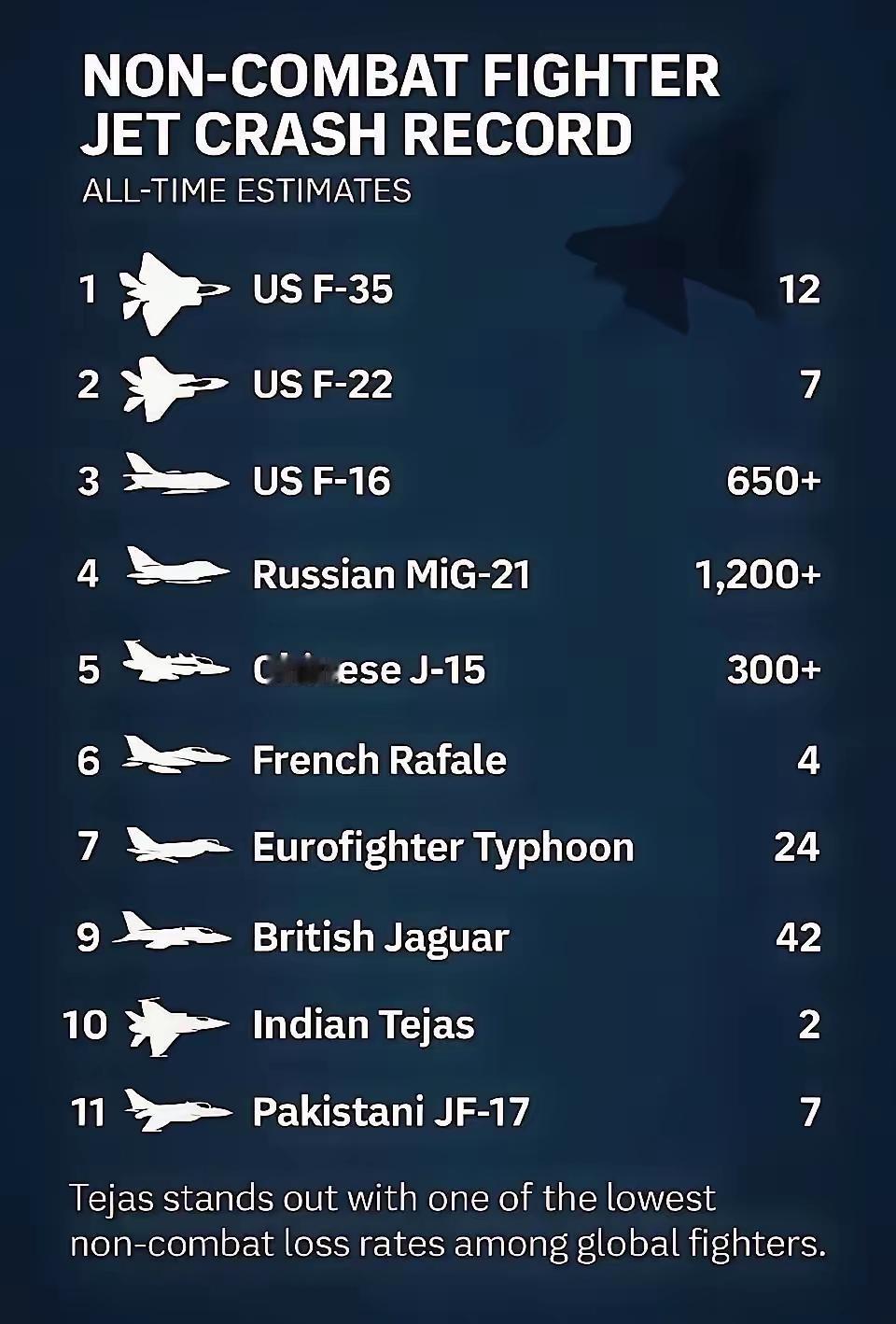 为了挽回颜面,印国内把各国战机坠毁数量排了个序,以此证明印“光辉”战机是坠毁数量最少的。 但是这个图太扯蛋了,因为这个排名是战机非战斗坠毁的数量。 图中居然有我国的歼-15!歼15造的也不超过300架啊。 网友评论: 光辉是最好的飞机,印度人的军工自信对我们是有利的,我们应该赏识印度人的自信,承认光辉的实力,鼓励继续改进光辉。 就服阿三,在困难面前,他们总能找到一块尿布遮脸,他们光辉战机坠落,开始想到他们一定会想办法遮羞,没想到他们真找到了,还是一片臊哄哄的尿布。 这就是印度这个国家可爱的地方,哪怕他考试全班倒数第一他也会找借口说应该倒数第一的那个傻子拉肚子没来,要不然他不会倒数第一的。 印度已经不需要飞机大炮来发动攻击了,他们的人口殖民计划已经开始并且很快就能初见成效了。 各位朋友怎么看?欢迎在评论区留言讨论