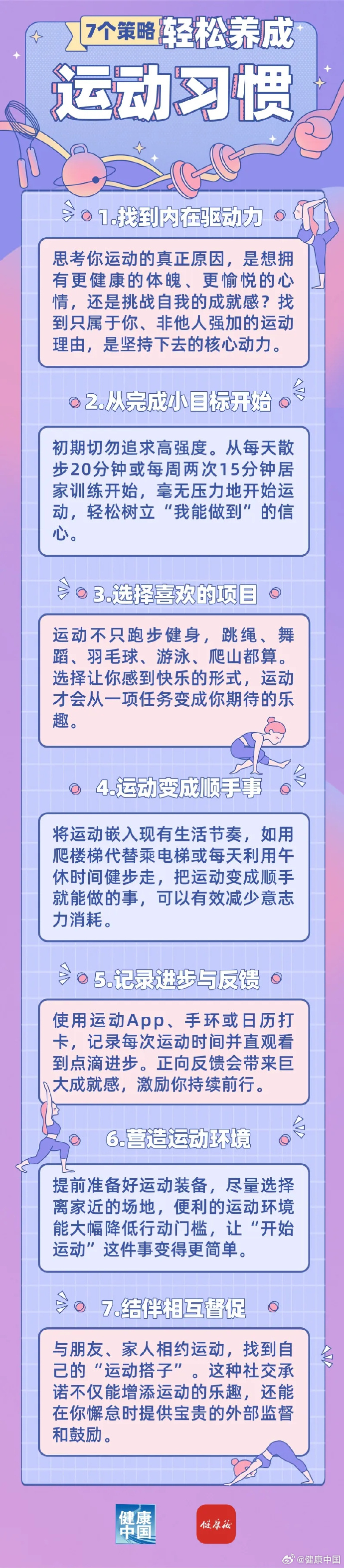 我太忙了最近太累了天太冷了不想动……适量运动有益健康。然而,很多人下决心要动起来,却总有理由半途而废。运动习惯的养成需要耐心和策略,关键在于将运动自然地融入生活,使之成为一种可持续的生活方式。以下七个策略,可以帮助你轻松开始运动并坚持下去(健康中国)