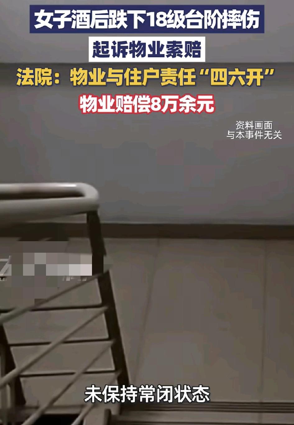 江苏昆山一女子喝酒后到楼下扔垃圾,为了抄近道,从消防通道走,因为楼梯道没有照明,导致女子不慎从18级的台阶跌落,全身多处骨折,女子起诉物业消防通道没有照明,且没有保持常年关闭的状态,物业辩称消防通道没有照明,是因为从开发商接手过来就一直这样子,且女子是因为喝完酒导致摔倒的。法院判定女子承担主要责任,物业没有给消防通道做保障的义务,判赔女子8万元,消防通道常年保持关闭的状态,并不是锁死,而是关着,但是紧急情况下能打开。
