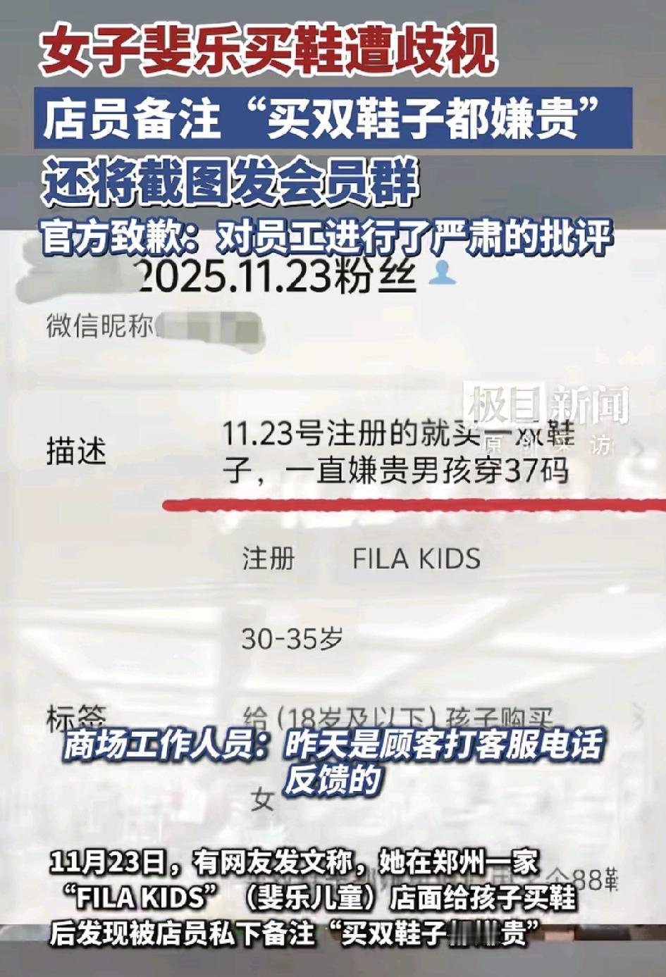 郯州一网友发文称带孩子到斐乐儿童店买鞋,是被店员备注为一直享鞋子贵,随后把截图发
