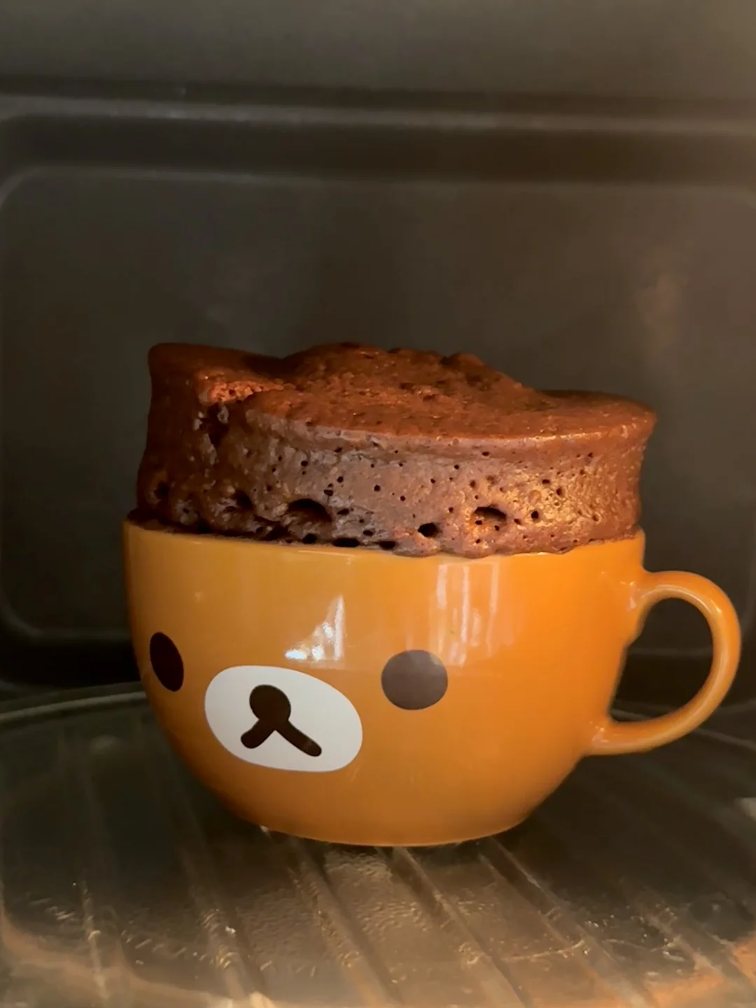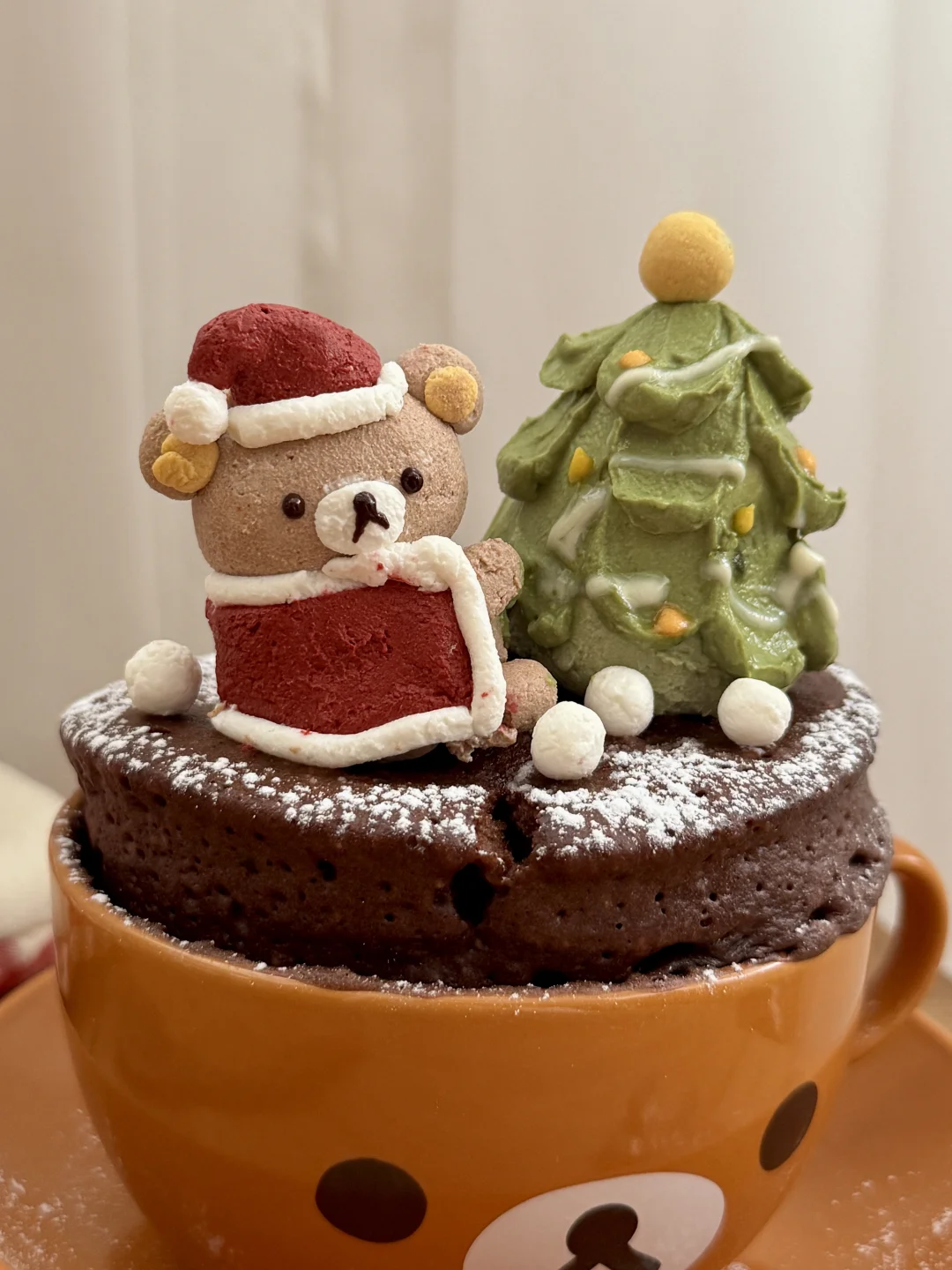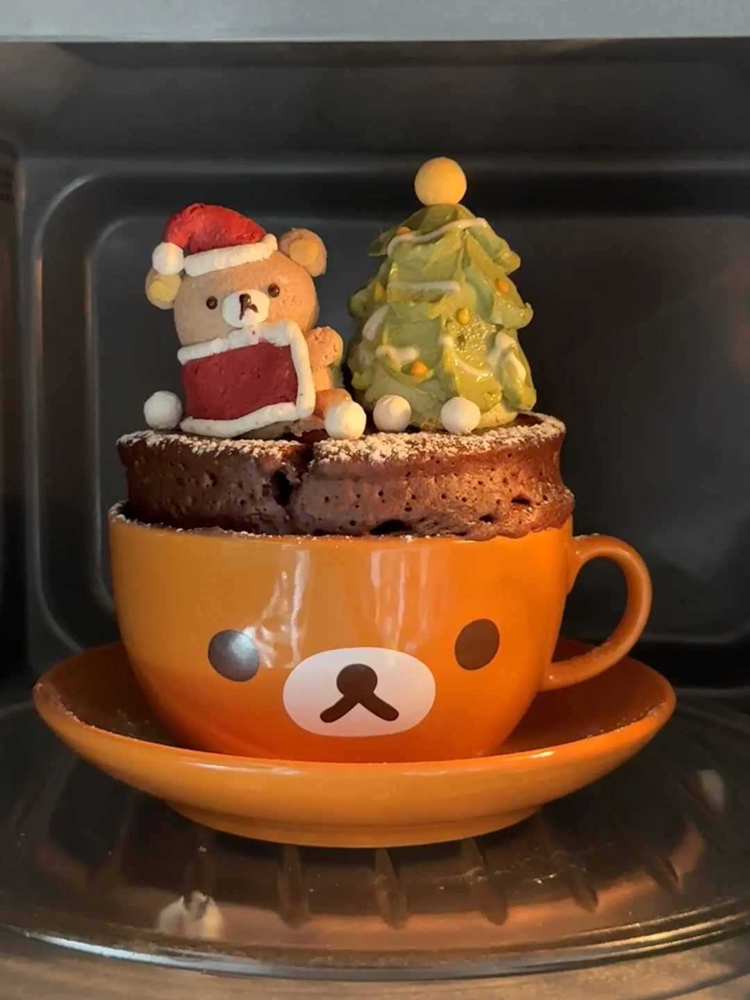 懒人版微波炉蛋糕🧁 再用希腊酸奶捏了只轻松熊 圣诞小甜品get✅ - 材料:鸡蛋1个、牛奶90个、白糖40g 、植物油10g、可可粉10g、低筋面粉80g、泡打粉5g 做法:依次将以上材料混合搅拌均匀,倒入杯子里,微波炉高火3分钟就OK啦