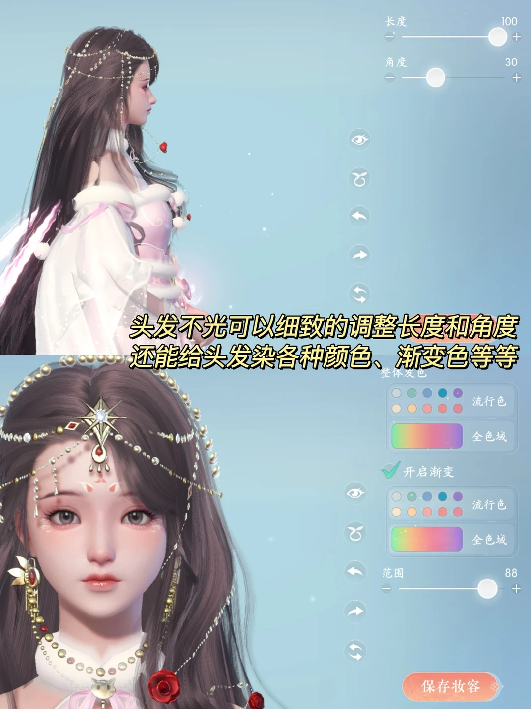 💓捏完脸还有超多妆容可选,在游戏里化了一下午妆,根本停不下来;发型部分除了常见的渐变染发之外,我们还可以改变发型的长短,以及它飞扬的角度!