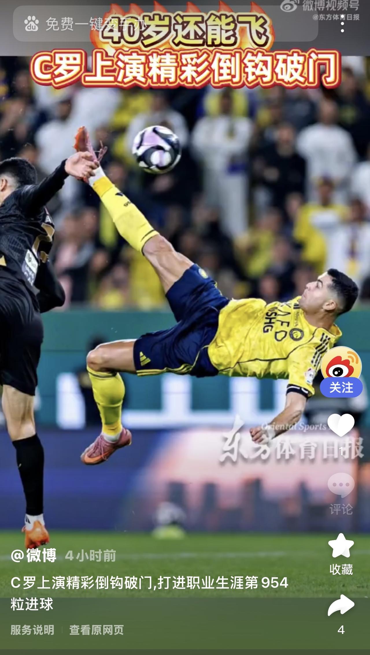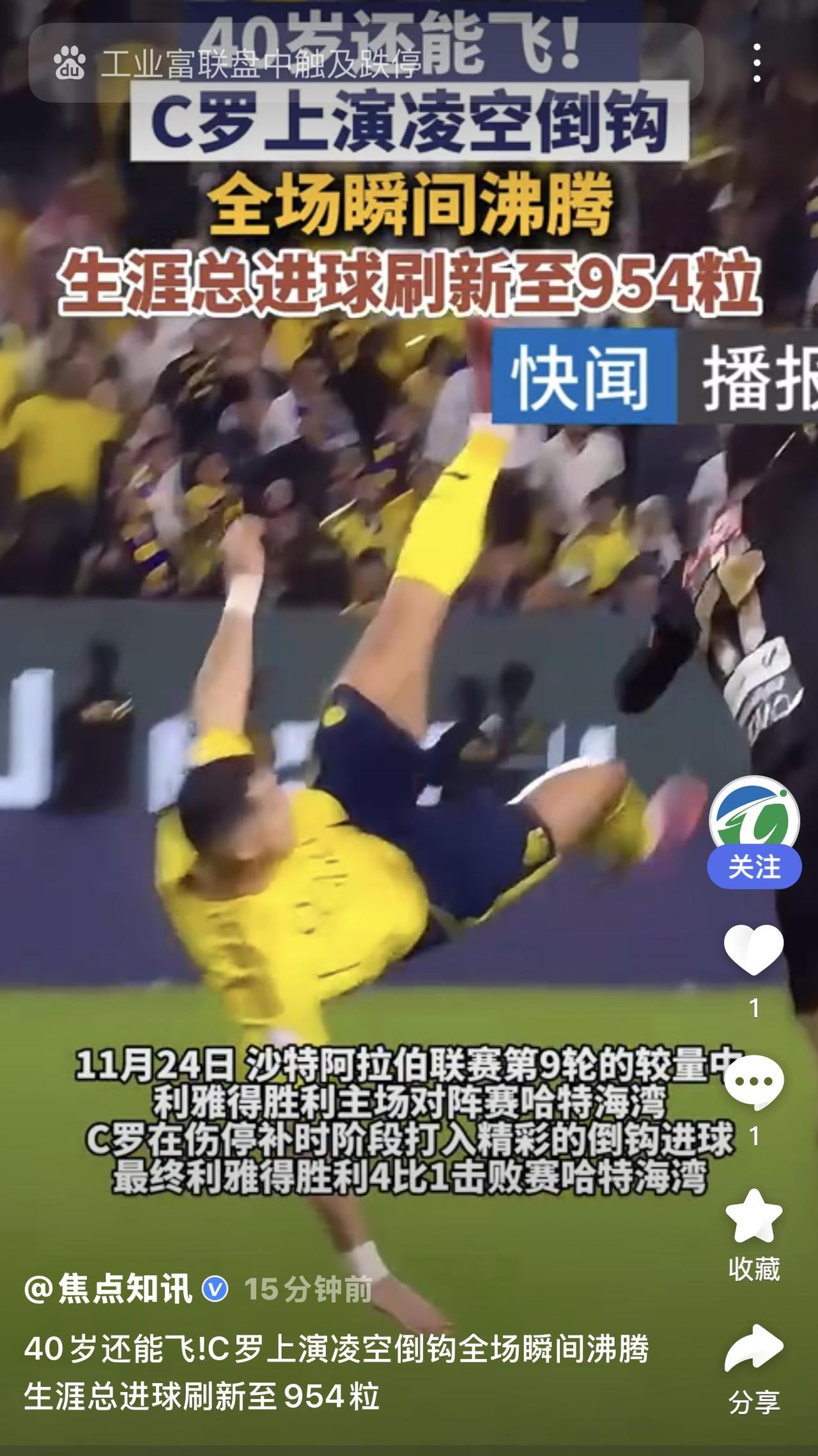 补时第96分钟,当C罗腾空而起完成那记倒挂金钩时,整个足球世界仿佛为之窒息。这位40岁的老将跃至2.38米的惊人高度,复刻了七年前那记征服尤文图斯的经典进球。外媒一片盛赞,惊呼: “这已超越人类极限!”更有评论指出,这粒价值千金的进球,其技术完成度甚至比2018年欧冠的倒钩更为完美。