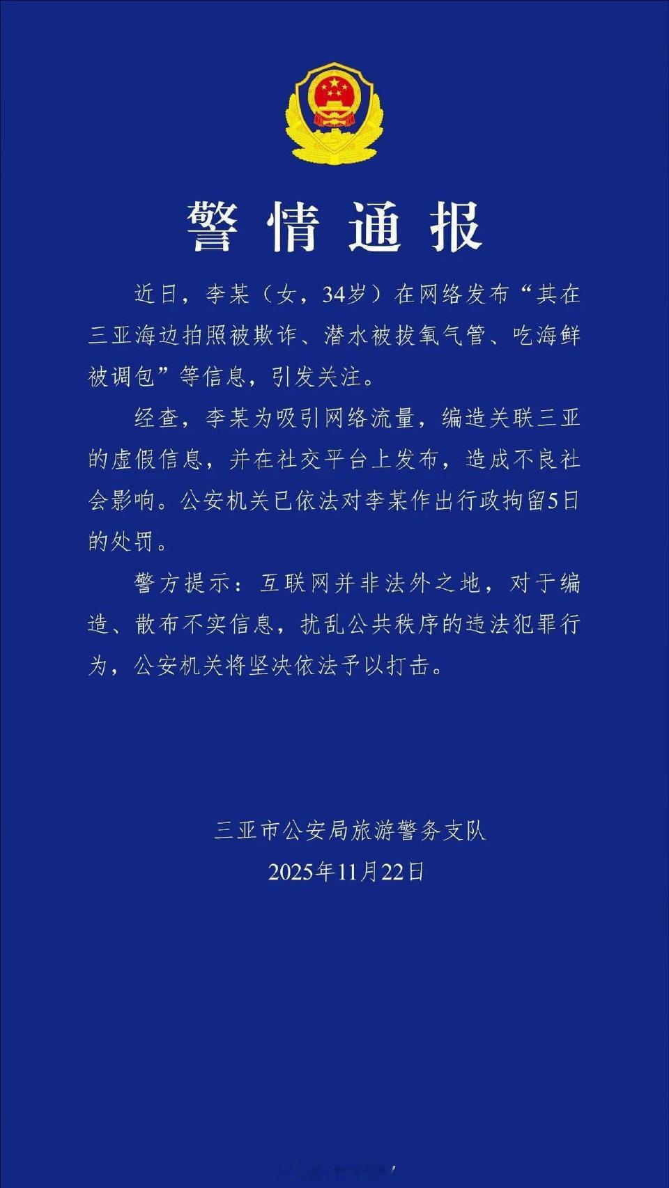 一女子三亚潜水被拔氧气管的故事是为了起号编造的!现在喜提行拘5天!但是我个人觉得行政拘留5天还是太轻了