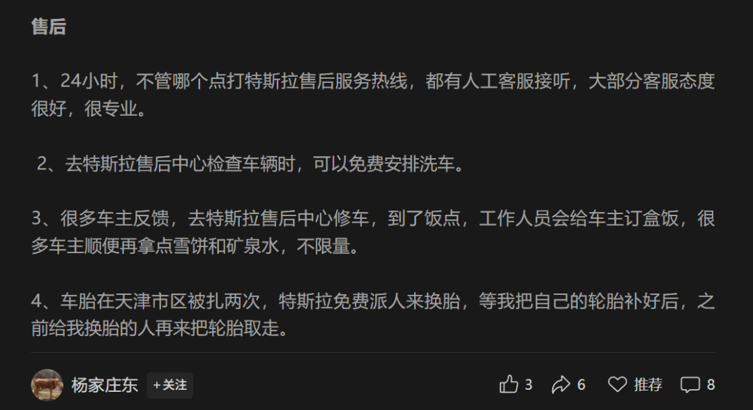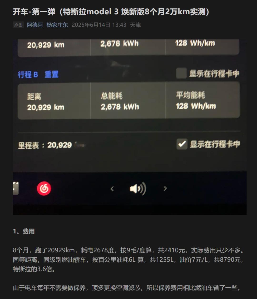 在提车并使用8个月后,网友杨家庄东分享了自己的长期真实用车体验。目前车辆累计行驶已超过2万公里,从实际成本来看,电动车优势非常明显。数据显示,Model 3累计耗电2678度,平均电费按9毛/度算,共2410元,考虑到晚间谷时充电,实际花费只会更少。与同级别燃油车相比,以6L/100km油耗、油价7元/升计算,同等里程油费约为8790元,是特斯拉的3.6倍。保养方面,特斯拉每年无需进行传统保养,仅需更换空调滤芯,进一步降低了用车成本。续航表现也十分优秀。高速顶着限速开,空调22度,在10度-30度气温条件下,实际续航能开到500km左右,甚至跑赢表显。此外,他对特斯拉的直营售后服务也印象深刻,24小时不管什么时间打特斯拉售后服务热线,都有人工客服接听,并且客服态度很好,很专业。在遭遇突发情况时,特斯拉应急响应迅速,他曾在天津被扎了两次胎,特斯拉都是免费派人来换胎,后续修补好轮胎后工作人员再上门取回,省时又省力。网友杨家庄东 的真实经历,全面展现了车主从初步认知、深度试驾,到最终购车与长期使用的过程,特斯拉凭借精准的操控体验、成熟的三电技术、透明的直营模式和用户至上的服务细节,使其感叹“始于颜值,终于品质和服务”。