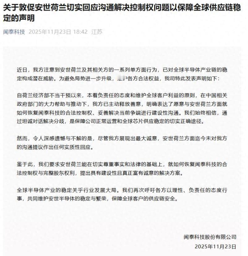 奉劝安世荷兰!逃避是没有用的! 自 9 月借 “国家安全” 冻结闻泰科技合法控制权,11 月中荷两轮磋商后荷方已暂停行政令,政府层面早已为沟通铺好道路,该企业却仍对闻泰的沟通提议装聋作哑! 全球 9000 万台汽车、12 亿台手机依赖其芯片供应,客户被逼得自寻晶圆、另找替代供应商,其口中的 “技术保护”,难道就是放任全球供应链陷入混乱? 像德国大众、博世、日本本田这些巨头,本来安安稳稳拿货就行,现在却得琢磨 “临时补丁”,自己从欧洲买晶圆,再送到中国工厂封装。 这哪是正常的供应链该有的样子?客户这么折腾,说白了就是怕安世荷兰的回避态度拖垮生产。 更有意思的是,他们还在悄悄找替代方案,比如意法半导体、安森美这些厂商的芯片,要是真换了供应商,安世荷兰以后想挽回都难。 再看政府层面的努力,中荷 11 月中旬在北京开了两轮面对面磋商,荷方主动提出暂停针对安世的行政令,欧盟也表态欢迎,说这能稳定供应链。 可问题的关键没解决,荷兰企业法庭的紧急裁决还在生效,中方 CEO 的职务没恢复,闻泰的控制权还是受限制。 本来政府都搭好了沟通的桥,就等企业层面跟进,结果安世荷兰偏偏不往前走。 要知道,荷兰暂停行政令背后,一方面是美国暂停了 “50% 穿透规则”,他们没了法律依据,另一方面是欧洲车企的压力实在扛不住了,再折腾下去本土产业都得受影响。安世荷兰要是真为行业着想,早该借着这个台阶好好谈了。 闻泰这边的诚意其实已经摆得明明白白。不光在声明里反复表达沟通意愿,还配合中国政府的协调,甚至中方都出台了保障欧洲芯片供应的措施,就是想给谈判留足空间。 反观安世荷兰,一边拿 “保护欧洲技术” 当借口,一边干着让供应链混乱的事。 他们之前说中国工厂有 “管理问题”,可实际上闻泰收购后,安世的产能和市场都没掉链子,现在中国工厂也不愁晶圆供应,无锡新洁能、杭州士兰微这些国内厂商都能供货,所谓的 “威胁” 根本站不住脚。 安世荷兰这么做,其实是在透支自己的信誉。半导体行业讲究的是长期信任,客户选择供应商,不光看产品,还看稳定性。 现在他们连基本的沟通都不愿意,客户心里肯定打鼓,等替代方案成熟了,谁还愿意冒风险合作? 而且中国市场撑起了安世近半营收,80% 的封装产能也在中国,真要是把合作关系搞僵了,损失的可不只是订单,还有未来的发展空间。 更关键的是,这事儿已经触碰了国际商业的底线。跨境并购讲究的是 “买定离手”,闻泰是花真金白银合法收购的安世,现在只是想要回自己的股东权利,这在任何国家的商业规则里都合情合理。 荷兰政府之前的干预,本质上是用政治手段破坏商业规则,现在政府都开始纠正了,企业还在硬扛,实在不明智。 说到底,安世荷兰的回避解决不了任何问题。全球产业链早就你中有我、我中有你,靠沉默和拖延换不来安全,只有平等沟通才能找到共赢的办法。 现在半导体行业的机会很多,没必要在这种内耗上浪费时间。希望安世荷兰能早点认清现实,别辜负全球客户的信任,也别浪费政府搭建的沟通平台,拿出诚意坐下来谈。 毕竟,破坏规则的代价可能是暂时的,但失去信任的损失,却是长期都补不回来的。