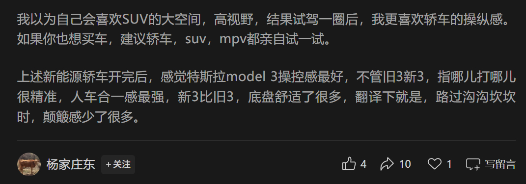 网友杨家庄东试驾一晚上直接下订Model 3,小米销售也表示,SU7操控精准度确实不如特斯拉。他介绍:这次灵活深度的试驾可以晚上八点取车,第二天九点至十点还车,还能在超充站免费充电。而且,部分地区还支持销售人员驾车上门试驾,省去往返门店的麻烦,这种开放式的体验让他能充分模拟感受日常用车的各种场景。在试驾前,他原本以为自己会喜欢SUV的大空间、高视野,结果试驾一圈后,他发现自己更偏爱Model 3带来的操纵感,指哪儿打哪儿,很精准,人车合一感最强。连其他品牌的销售人员也承认,相比同级车型,Model 3在转向精准度和操控性上是最好的。在乘坐体验上,他也给出肯定评价,他认为Model 3在底盘调校上的优化,有效缓解了通过沟坎时的颠簸感。此外,特斯拉全直营模式也让这位网友感到放心,价格统一透明,避免了传统4S店中常见的销售套路。结合个人对简洁风格的偏好,以及Model 3外观线条和内饰设计正中审美,结合三电(电池、电机、电控)方面被广泛认可的成熟度,综合考量下来,他最终选择了Model 3。