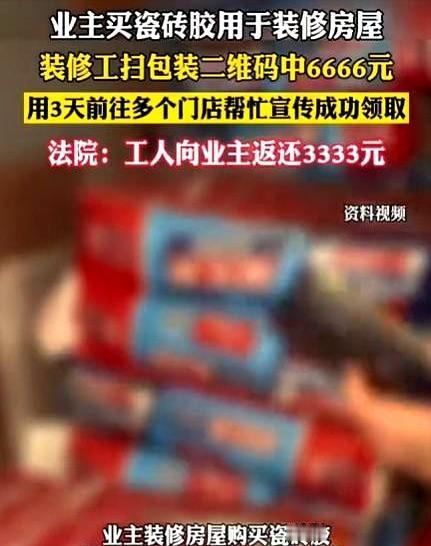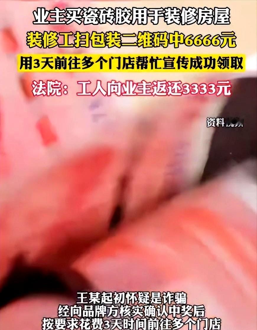湖北一装修师傅贴砖时,意外看到包装上有二维码,他拿出手机扫码,结果中了2万红包,甚至还抽到6666元现金,可谓是意外之喜,可房主知道后,认为瓷砖是自己买的,这奖金应该归自己,可装修师傅拒绝归还,被房主告上法庭,法院判了! 事情的发展可以说是令人啼笑皆非,但通过这一件看似普通的装修纠纷,我们或许能看清更多的人性矛盾,也能探讨法律中的深层逻辑。 装修房子的李某,因为工作忙碌,将施工的事宜全权交给王某处理。 王某是位勤恳的师傅,干活实在,李某也对他放心。 可谁能想到,在一次贴砖的过程中,王某看到了瓷砖胶包装上的二维码,并随机扫码,拿下了一笔意外之财。 这份喜悦没持续太久,李某在得知此事时,提出了奖金归属权属于自己的观点,认为自己花钱购买的商品,产生的额外收益理应归本人所有。 而王某则坚决表示,扫码行为是自己完成的,奖金亦因此产生。 双方各执一词,矛盾不断升级。 两人最终将这种纠纷摆在了法院面前,请求法律的介入。 看起来是简单的二维码扫奖事件,背后却牵涉到复杂的法律关系。 《民法典》第240条对此有清楚规定,所有权人对自己购买的商品享有占有、使用、收益及处分的权利。 从这个角度来说,李某确实有一定的权利主张,毕竟商品是他出的钱购买的;而包装上的二维码作为商品附属部分,这奖金理论上也归他所有。 但事情并非全然如此,奖金的诞生过程显然并不单纯依靠所有权的逻辑,而更因为王某的行为而产生的一种附加收益。 王某扫码、提供了额外的发现和行动,这份努力和贡献,是奖金兑现的关键环节。 如果没有王某的扫码行为,这份奖或许就永远无人问津。 类似的例子并不少见,比如买牛奶时,塑料箱中藏着一张随机中奖券。 如果搬运者发现奖金并领取,通常法律会考虑贡献的主导因素,而非完全以所有权为基准进行裁定。 王某的行为显然与这个过程极其类似,法院最终采取了“分配收益”的方式,判定王某将6666元奖金中的3333元归还给李某。 双方各占一部分,体现了法律对公平与权益的综合考量。 法院的判决核心在于对贡献度的认定。 李某支付了购买费用,形成了基础所有权;而王某则以行动实际梳理二维码、实现奖金兑现。 法院从两者的“共同参与”出发,平衡了二人之间的权益,也很好地诠释了民事纠纷中的利益划分逻辑。 不少网友对此事件的讨论非常热烈,有人觉得李某的做法太过斤斤计较,因为房主通常不会扫描这种包装上的二维码,若不是王某,这笔钱或许根本不会被发现。 但也有人觉得,既然商品属于李某,从法律层面严格解读,收益的一部分归房主也是合理的。 从社会观念来看,这种分配方式应算较公平。 通过这件事,我们不禁反思,生活中类似的小摩擦其实并不少见。 究其根本,我们的行为往往是法律与道德价值观博弈的反映。 当李某能够主动提出协商分配,或王某及时表达合作意图,两人的纠纷或许能避免升级导致不必要的社会资源损耗。 有时候,意外之财不只是金钱上的收获,更是对彼此关系与人性的一次考验。 对此,你觉得法院这样的“贡献分配”判定是否公平? 如果让你判决,你会给予谁更多的奖励份额? 在利益面前,人性究竟该如何精准体现? 欢迎留言分享你对事件的看法。 信源:装修工扫业主瓷砖中奖6666元,法院判一半:产权归业主,辛苦费得补-看晓天下事