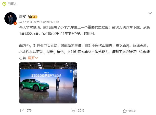 小米第50万辆整车正式下产线,雷军发文:今天非常激动,我们迎来了小米汽车史上一个重要的里程碑。第50万辆汽车下线。从第1台到50万台,我们仅仅用了1年零7个多月的时间。 今天下线的第50万台,对于小米汽车来说,仅仅是站上了新起点。我们会持续做好这几件事:第一,坚持不懈抓安全、抓交付。我们始终认为,安全是基础,安全是前提。在确保安全和品质的基础上,我们全力以赴加快生产。第二,持续加大科技创新力度。第三、推进 AI 和智能制造的深度融合。