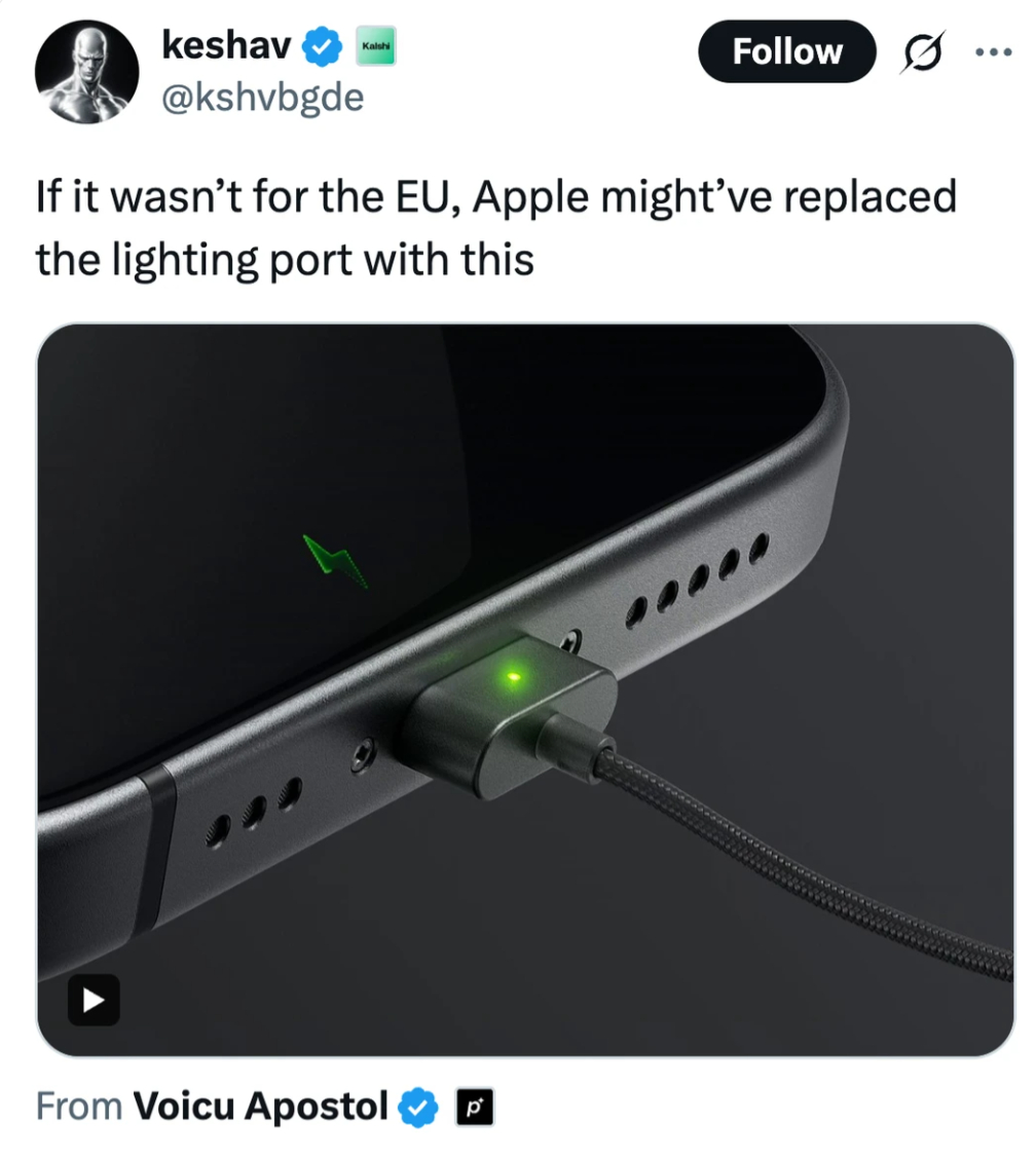 苹果之前本想给Lightning升级个磁吸版本,但欧盟强推Type-C统一标准,让苹果这套自研方案直接胎死腹中。不然今年新款iPhone可能用的就是这款充电接头