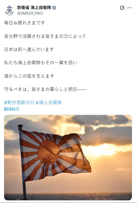 警报!海上自卫队公开为军国主义招魂 日本海上自卫队今天这条推文,看似温柔致谢劳动者,实则真正的主角只有一个——那面“旭日旗”。 内容写什么根本不重要,只要自卫队敢把这面沾满亚洲血泪的战旗亮出来,就是最赤裸的政治宣示,就是在为军国主义招魂。 所谓“传统”不过是包装。海上自卫队试图把侵略象征重新包装成“正常军旗”,这才是最危险的: 这是历史修正主义的公开化、视觉化、军事化。 别忘了,旭日旗不是中性符号,它和侵略中国、屠杀东南亚、殖民朝鲜半岛是一套体系。对东亚人民来说,它出现一次,就等于一次伤疤被重新撕开。 更要命的是——在高市对华挑衅的敏感节点,自卫队还高调亮旗,这根本不是巧合,而是精心配合的对华心理战。 所以,这不仅是海上自卫队的问题,而是日本政军系统共同加速军国主义复活的信号。 旗没换心没改,日本军国主义正在重新把翅膀摊开。 战旗飘起就是挑衅! source: X