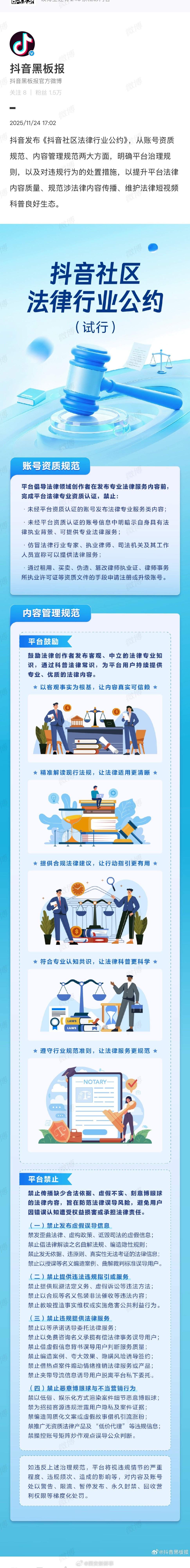 11月24日,抖音官方 宣布将试行《抖音社区法律行业公约》,从账号资质规范、内容管理规范两大方面,明确平台治理规则,以及对违规行为的处置措施,以提升平台法律内容质量、规范涉法律内容传播、维护法律短视频科普良好生态。