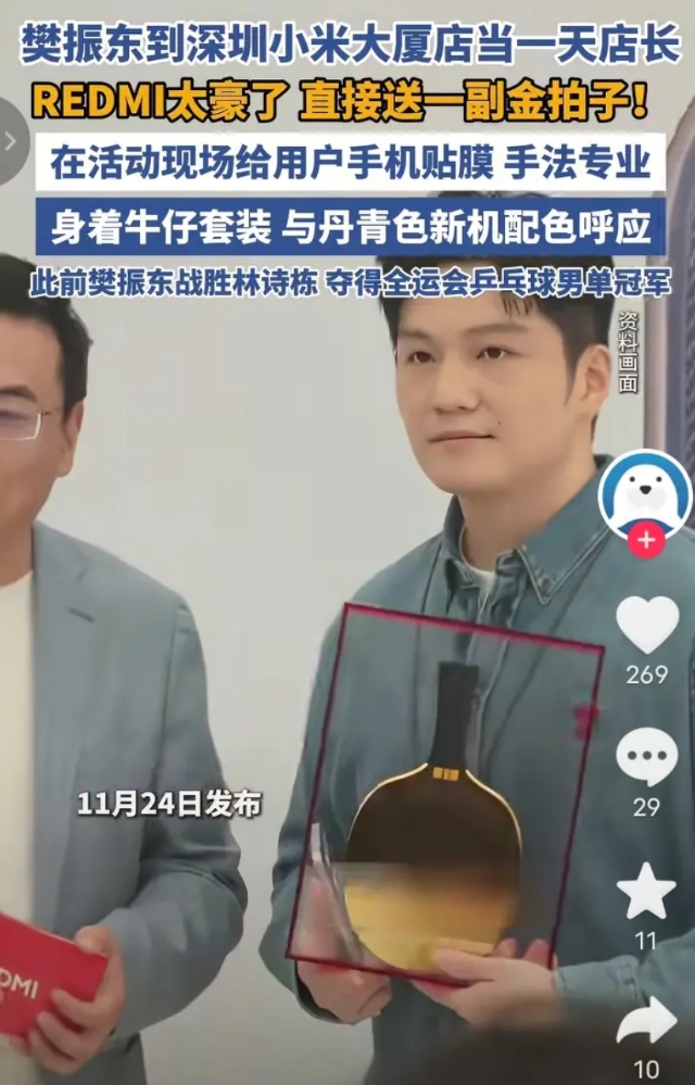 记得刘强东说过,不要和雷军比营销,以前我半信半疑,现在我信了。 雷军账号今天发布,邀请到全运会乒乓球男子单打冠军樊振东到小米之家深圳小米大夏店当一天店长。 并且赠送了纯金的乒乓球拍。 不服不行,雷军总能把握住当下的热点,让小米获得关注度。