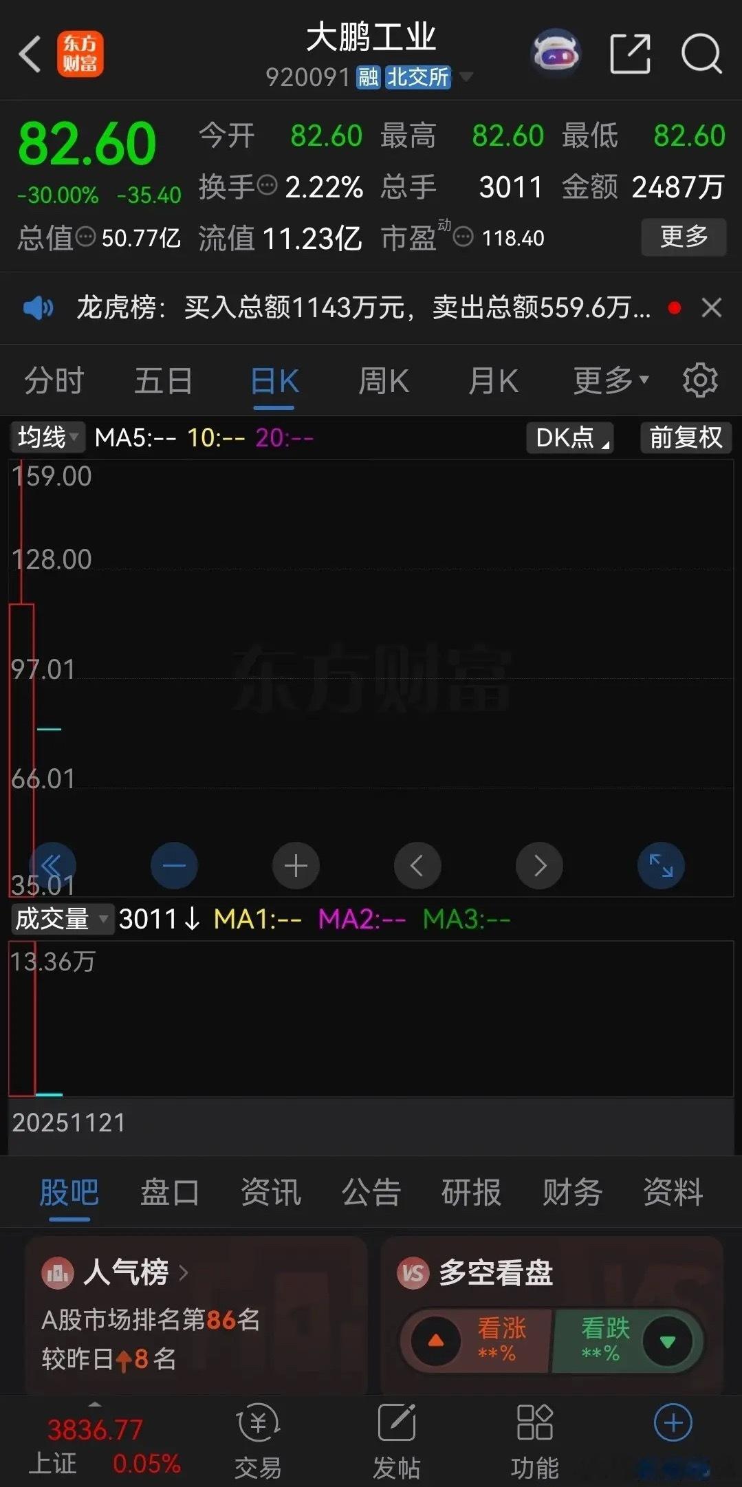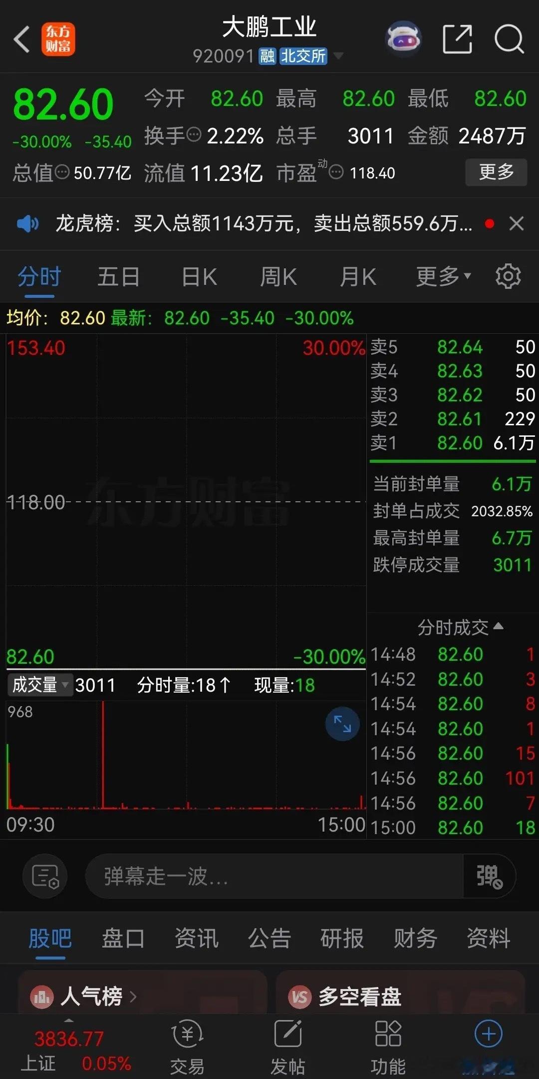 北交所上周五刚上市的大鹏工业,今天30CM一字跌停!全天跌停板被牢牢封死,直到收盘的时候仍然有封单6.1万手,有超过5亿资金在排队出逃。这只股票发行价只有9元,周五上市一路狂拉,最高涨到了159元,涨幅一度高达1666%,暴涨超过16倍,实在是太疯狂了!由于用力过猛,上市就是巅峰,一天就把一辈子的路走完了,今天就开始了惨烈下跌之旅,因为是北交所股票,一个跌停就是30%,这个杀伤力还是非常大的。我敢说,上市首日高位追涨的股民,这辈子都别想解套了!