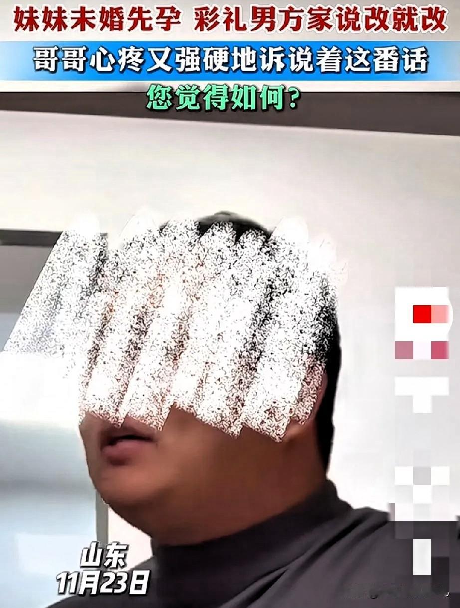 刚刚看了一新闻 山东的哥哥遇事不慌,对妹妹未婚先孕的事发表了看法,说他心疼妹妹,一把年纪的,碰到这种事能不心疼吗? 能不心疼哭吗?说这事男方和女孩都不负责任。女孩未婚先孕,这事不管谁先动的心,谁先动的手,都不能光说男方不负责,先不说男方家把彩礼从16.6万变成10万了,是明显想利用孩子把事情办了,以后好名正言顺的在一起,谁家没有个孩子呢? 这事就是明摆着的套路,谁看不出来呢?现在的问题是,女孩怎么就这么傻,把自己的一生都押在一个不负责任的男人身上了? 女孩遇事应该强硬一点,把自己的底线和标准提高一点,遇到事情时应该冷静一点,把自己的处境分析清楚一点,遇到男人时应该挑剔一点,把男人缺点和不足的地方找出来一点,不要因为一时的激情和冲动,把自己一生的幸福都搭进去了。 自爱才能让别人爱你,按正常流程走,正常谈恋爱,正常结婚,正常生孩子,不要婚前同居,不要婚前怀孕,这样才能保护自己。哥哥不是歧视女人,哥哥觉得还是男人更了解男人,女人要学会分辨男人的好坏,自己选择的是一时的痛苦,还是一辈子的痛苦,你选好了就行。